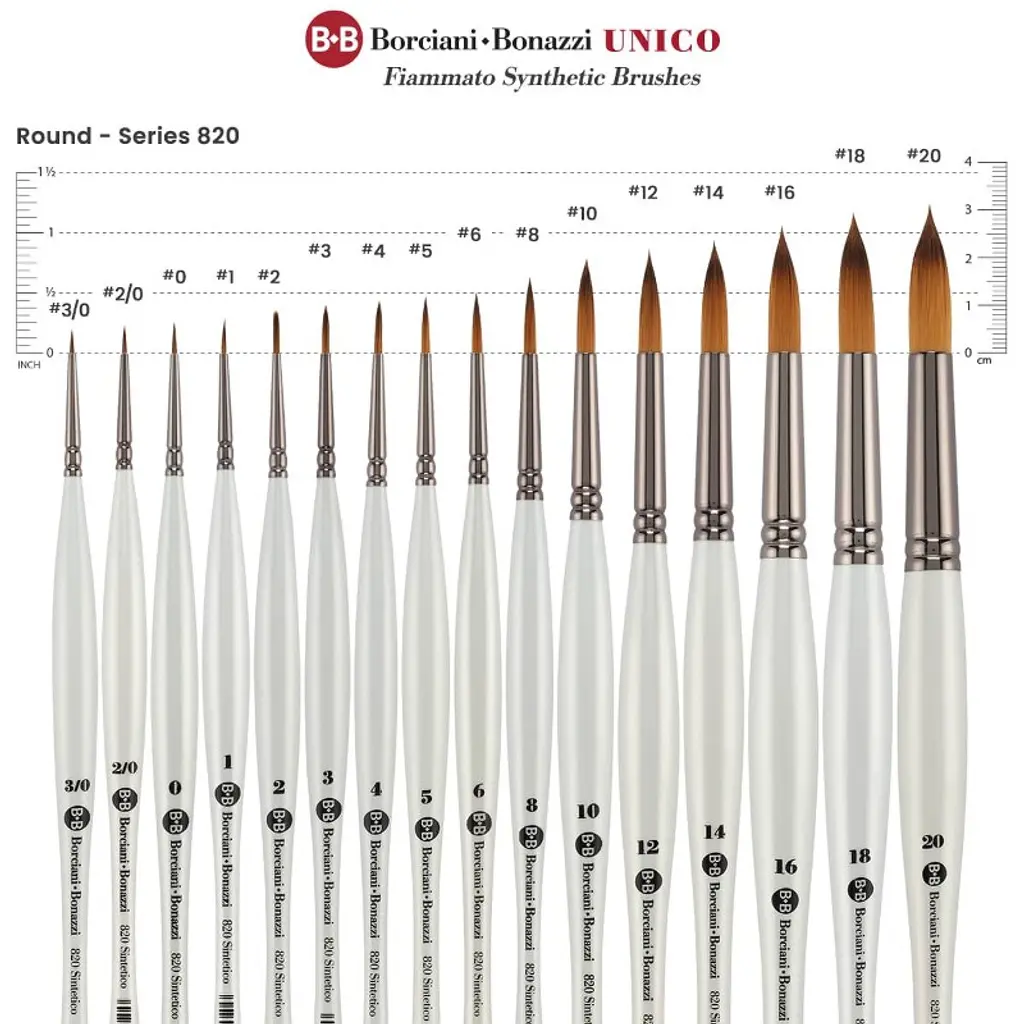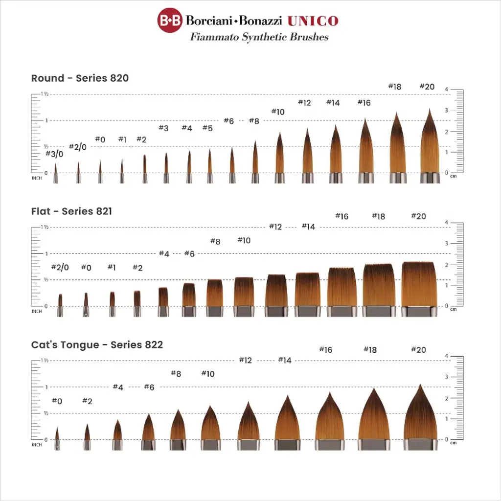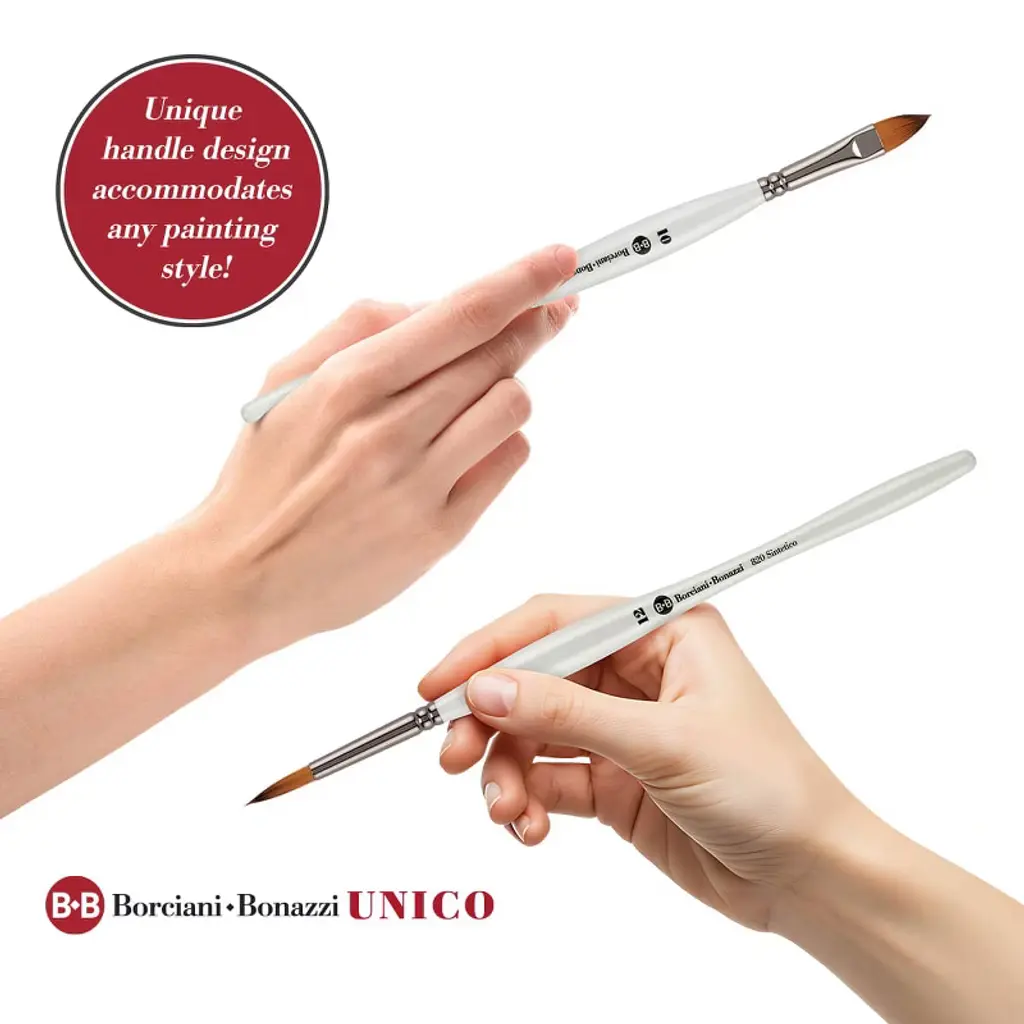 Introducing the Borciani e Bonazzi UNICO® Fiammato Synthetic Paint Brush, a masterpiece that embodies the elegance and precision required by artists across the globe. Handcrafted in Italy by skilled artisans, this paint brush is designed with ultra-soft synthetic bristles that effortlessly adapt to your painting technique, whether you're creating soft gradients, crisp details, or expressive strokes. With its ability to glide over surfaces and create precise lines without unwanted marks, the UNICO® Fiammato is a top choice for watercolorists, illustrators, and hyper-realists. Its absorbent bristles hold and slowly release water and color, making it ideal for watercolor and acrylic painting. Perfect for those who value animal-friendly alternatives, this brush's synthetic bristles offer the same level of performance as traditional natural hair brushes. The Borciani e Bonazzi UNICO® Fiammato features a medium white lacquered handle that is both balanced and ergonomic, reducing hand strain during extended painting sessions. The handle is of medium length, providing the perfect balance for detailed work or for those who prefer to grasp towards the end when working at an easel. Its anti-roll design ensures your brush stays in place when not in use, allowing you to focus solely on your art. The gun-metal brass ferrule adds a touch of sophistication while ensuring the durability of the brush. Whether you're working with watercolor, acrylics, or model paints, this brush is an essential tool in your artistic arsenal. Discover the joy of painting with Borciani e Bonazzi's UNICO® Fiammato Synthetic Paint Brush. Its great elasticity and ability to hold and release water smoothly makes it perfect for creating flawless color applications, whether you're working with watercolors or acrylics. Elevate your art with a brush that is as expressive and detailed as your vision, and experience the artistry of handcrafted excellence with Borciani e Bonazzi.