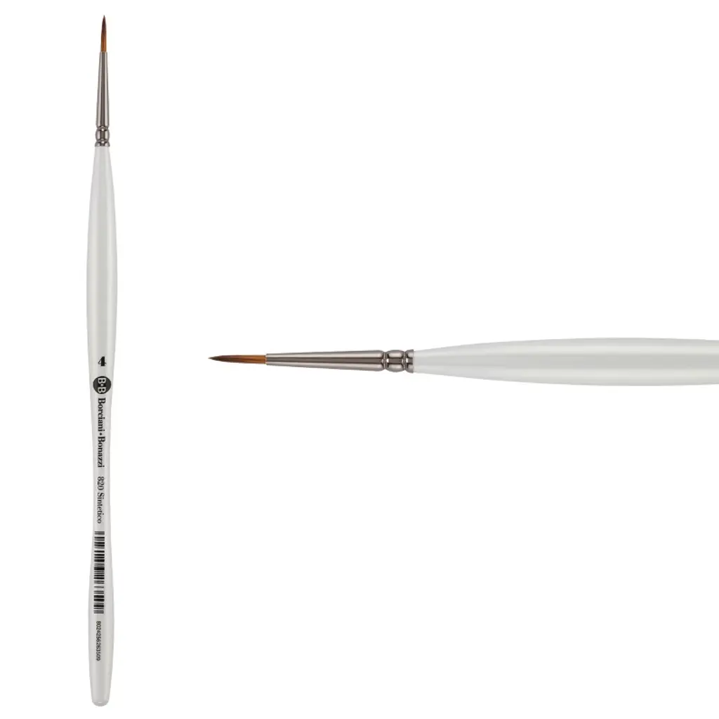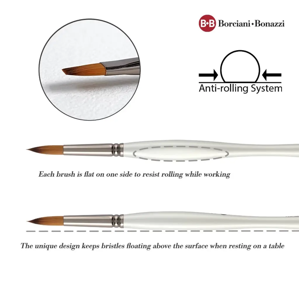 Introducing the Borciani e Bonazzi UNICO® Fiammato Synthetic Paint Brush, a masterpiece that embodies the elegance and precision required by artists across the globe. Handcrafted in Italy by skilled artisans, this paint brush is designed with ultra-soft synthetic bristles that effortlessly adapt to your painting technique, whether you're creating soft gradients, crisp details, or expressive strokes. With its ability to glide over surfaces and create precise lines without unwanted marks, the UNICO® Fiammato is a top choice for watercolorists, illustrators, and hyper-realists. Its absorbent bristles hold and slowly release water and color, making it ideal for watercolor and acrylic painting. Perfect for those who value animal-friendly alternatives, this brush's synthetic bristles offer the same level of performance as traditional natural hair brushes. The Borciani e Bonazzi UNICO® Fiammato features a medium white lacquered handle that is both balanced and ergonomic, reducing hand strain during extended painting sessions. The handle is of medium length, providing the perfect balance for detailed work or for those who prefer to grasp towards the end when working at an easel. Its anti-roll design ensures your brush stays in place when not in use, allowing you to focus solely on your art. The gun-metal brass ferrule adds a touch of sophistication while ensuring the durability of the brush. Whether you're working with watercolor, acrylics, or model paints, this brush is an essential tool in your artistic arsenal. Discover the joy of painting with Borciani e Bonazzi's UNICO® Fiammato Synthetic Paint Brush. Its great elasticity and ability to hold and release water smoothly makes it perfect for creating flawless color applications, whether you're working with watercolors or acrylics. Elevate your art with a brush that is as expressive and detailed as your vision, and experience the artistry of handcrafted excellence with Borciani e Bonazzi.