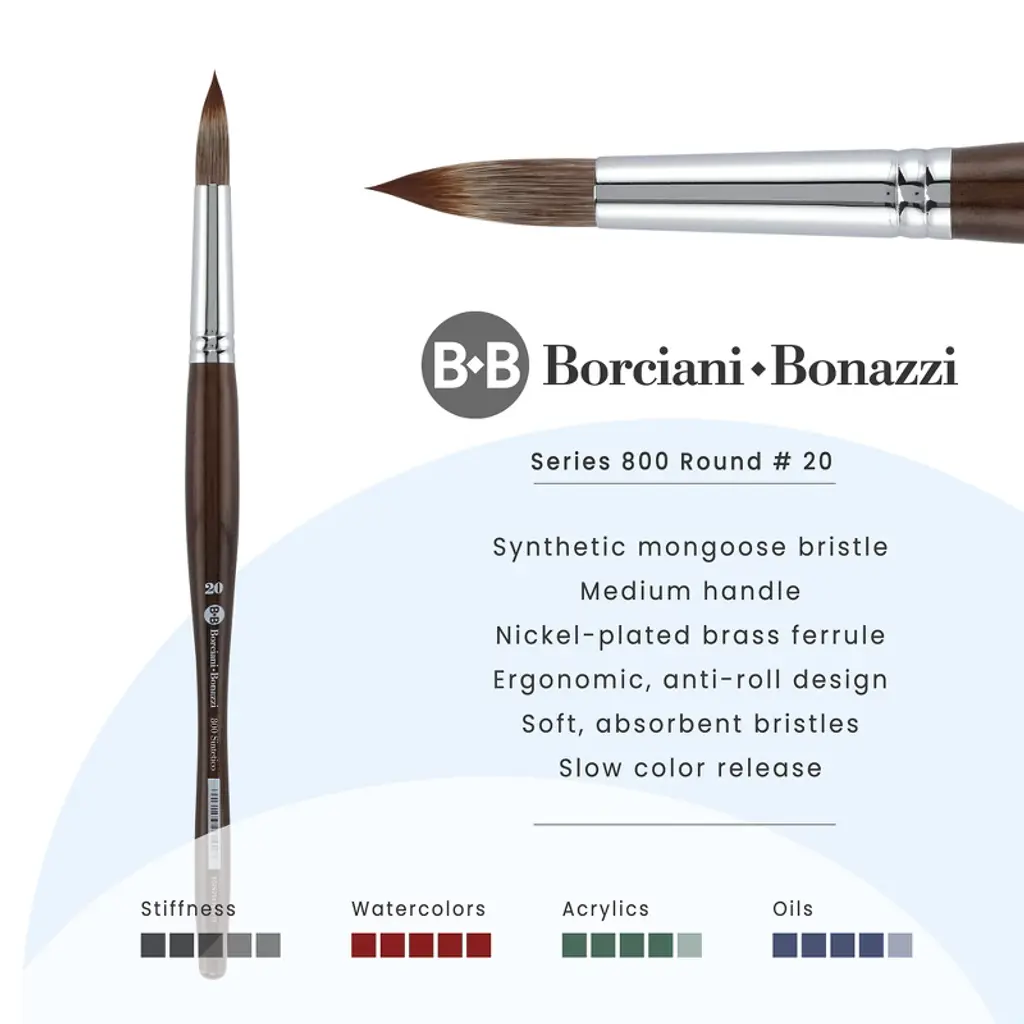 Borciani E Bonazzi Unico Synthetic Mongoose Artist Paint Brush - Series 800 Round - Size #20 - Watercolors, Oil & Acrylic Paint - Handcrafted In