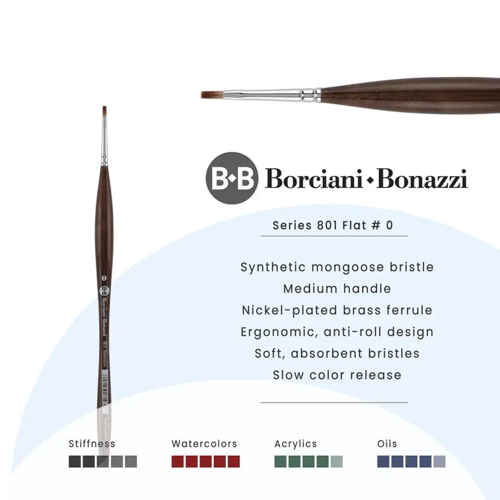 Borciani E Bonazzi Unico Synthetic Mongoose Artist Paint Brush - Series 801 Flat - Size #0 - Watercolors, Oil & Acrylic Paint - Handcrafted In Italy,