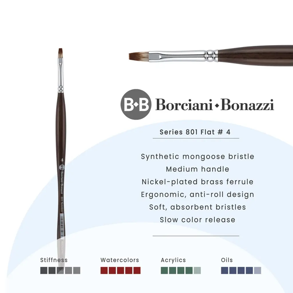 Borciani E Bonazzi Unico Synthetic Mongoose Artist Paint Brush - Series 801 Flat - Size #4 - Watercolors, Oil & Acrylic Paint - Handcrafted In Italy,