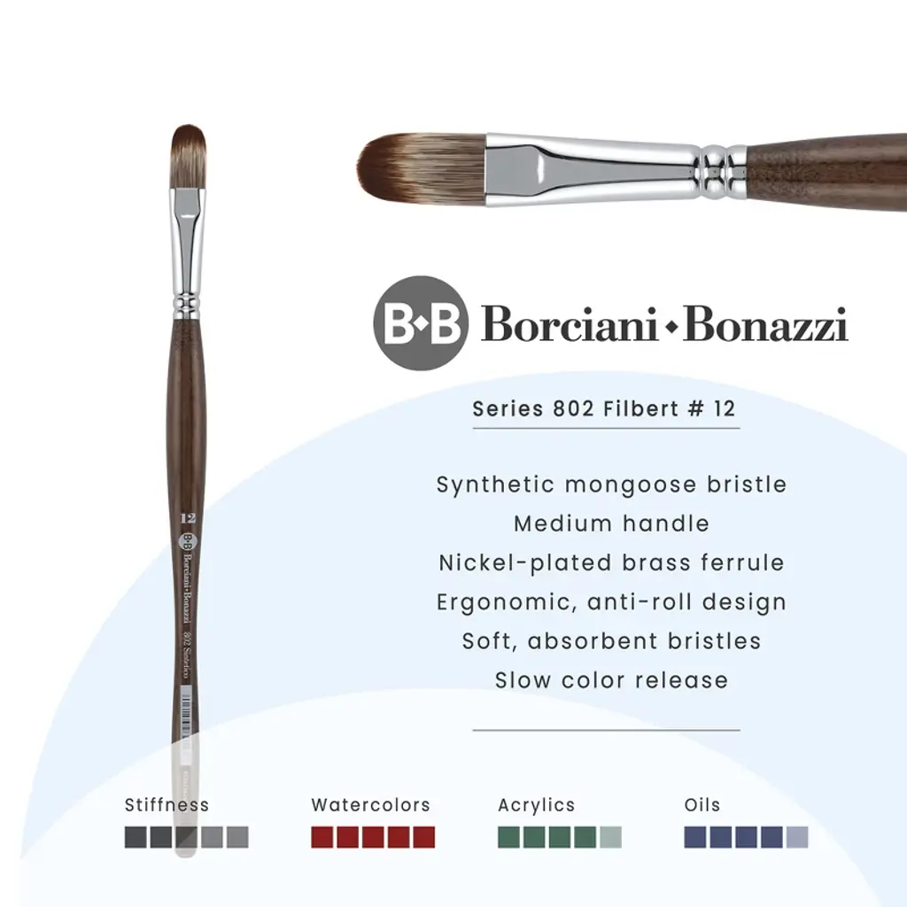 Borciani E Bonazzi Unico Synthetic Mongoose Artist Paint Brush - Series 802 Filbert - Size #12 - Watercolors, Oil & Acrylic Paint - Handcrafted In