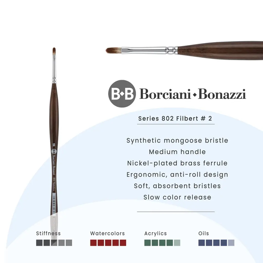 Borciani E Bonazzi Unico Synthetic Mongoose Artist Paint Brush - Series 802 Filbert - Size #2 - Watercolors, Oil & Acrylic Paint - Handcrafted In