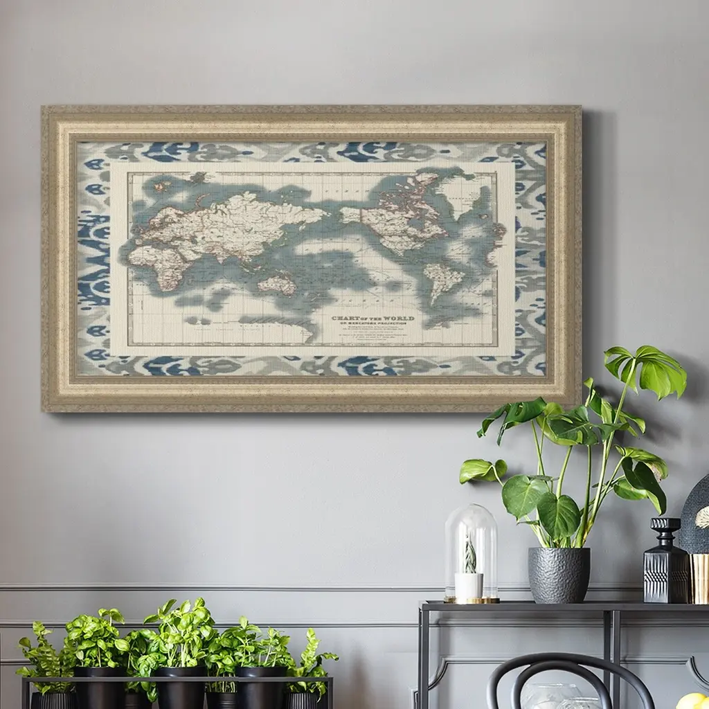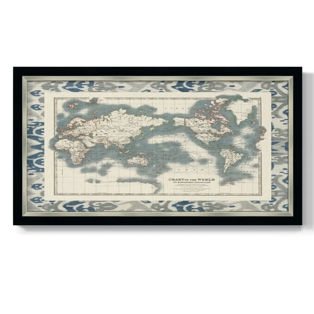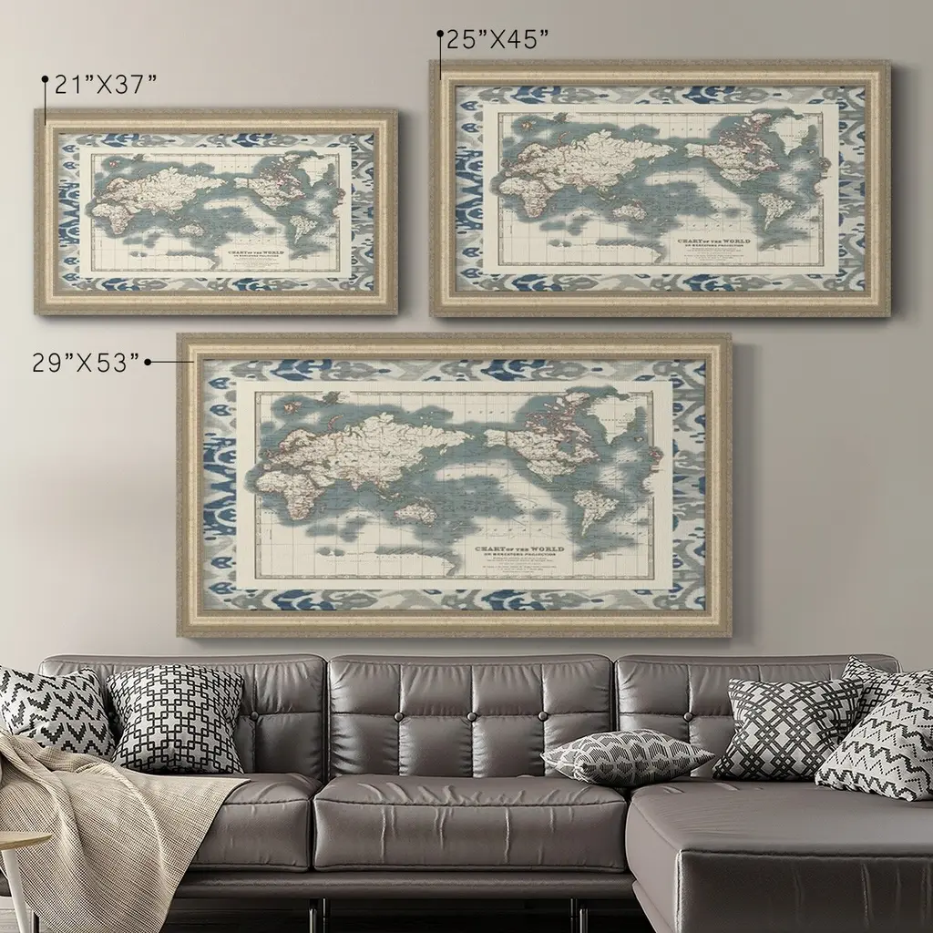 Bordered Chart of the World Premium Framed Canvas- Ready to Hang A Premium Framed Canvas created to last. Framed in distressed wood and available in an array of sizes and colors Featuring a beveled a solid wood stretcher bar, each piece comes ready to hand 3 SIZES AVAILABLE 21''X37'' - Overall Size 25''X45'' - Overall Size 29''x53'' - Overall Size Each piece is made to order. Each piece comes with hanging hardware. Made in the USA Ready to Hang Giclee Paper Print Acrylic Glass Beveled Matt Board