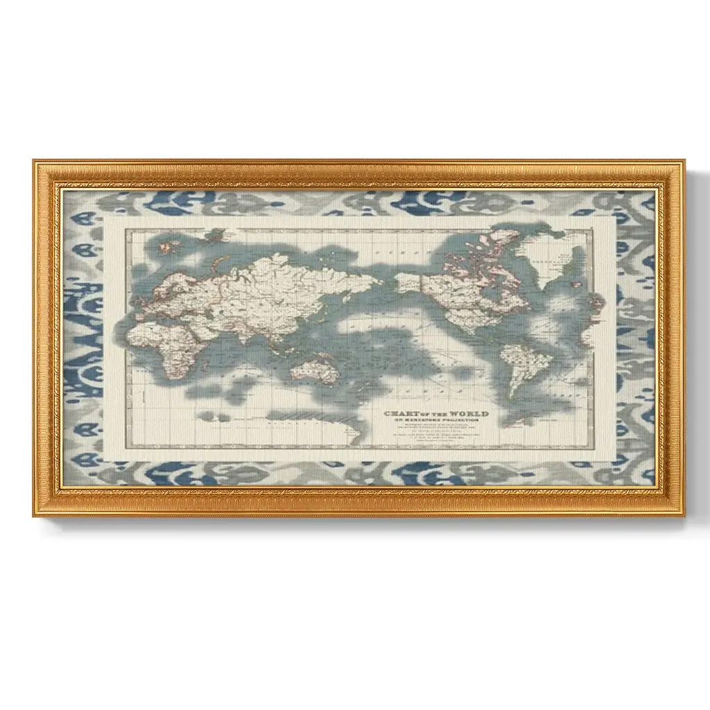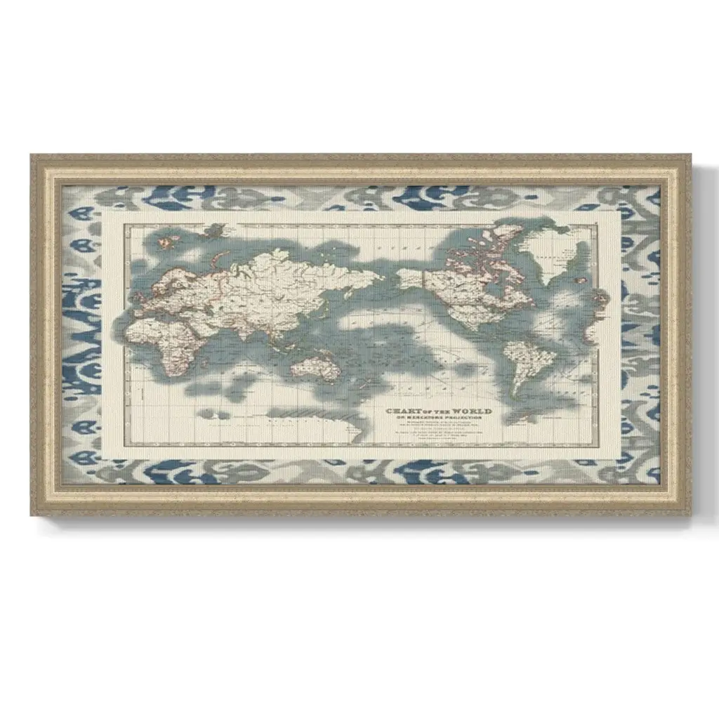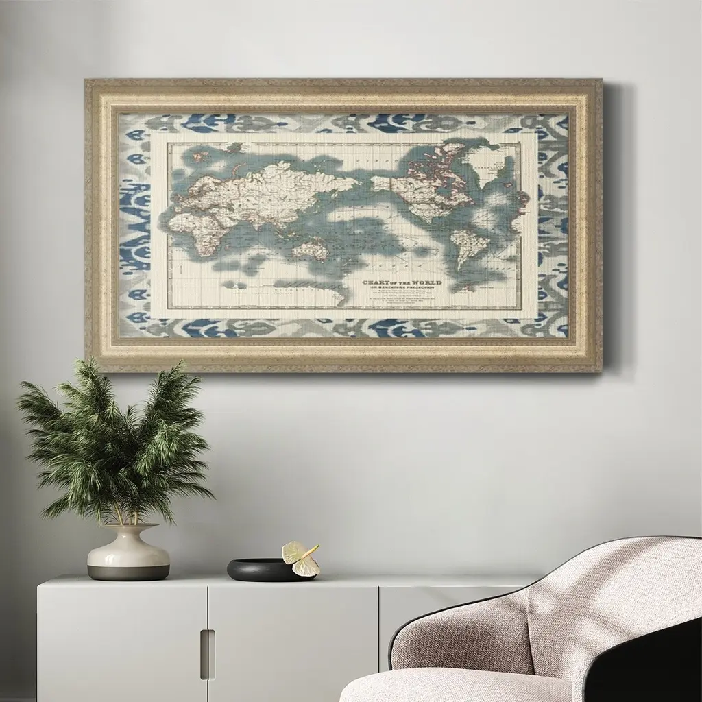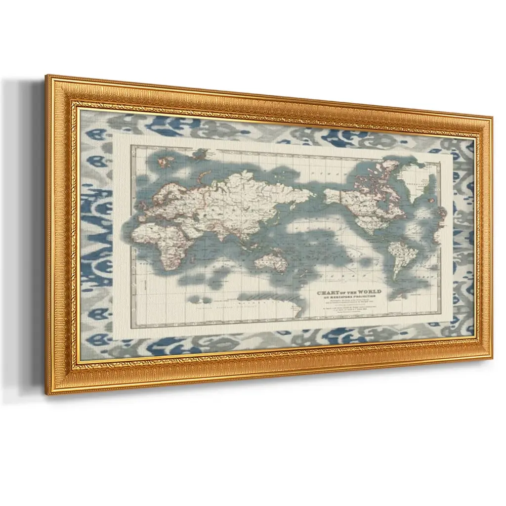 Bordered Chart of the World Premium Framed Canvas- Ready to Hang A Premium Framed Canvas created to last. Framed in distressed wood and available in an array of sizes and colors Featuring a beveled a solid wood stretcher bar, each piece comes ready to hand 3 SIZES AVAILABLE 21''X37'' - Overall Size 25''X45'' - Overall Size 29''x53'' - Overall Size Each piece is made to order. Each piece comes with hanging hardware. Made in the USA Ready to Hang Giclee Paper Print Acrylic Glass Beveled Matt Board