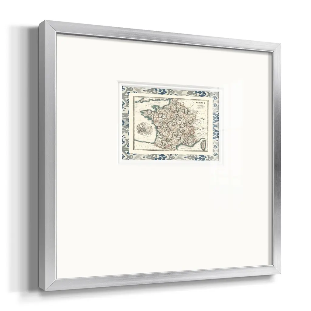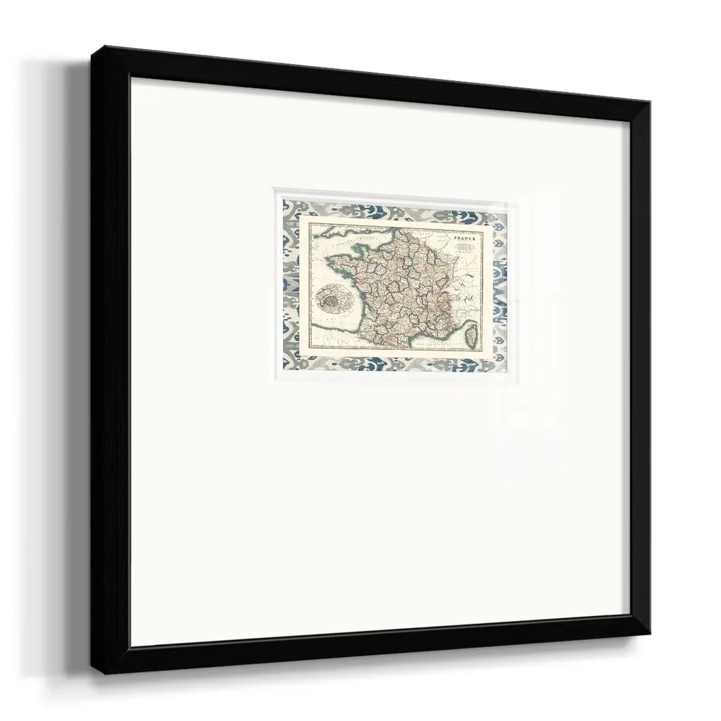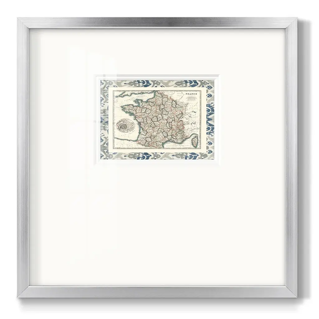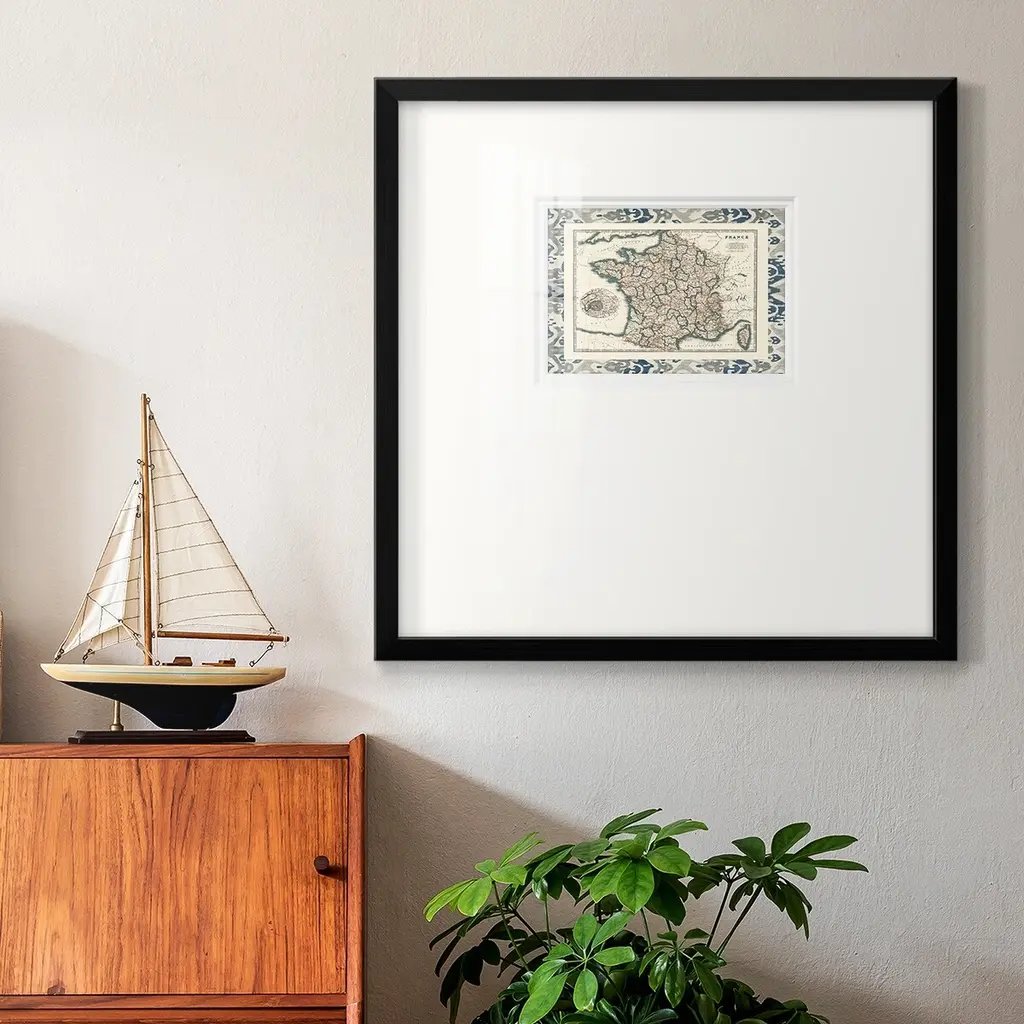 Bordered Map of FrancePremium Framed Print A framed cold pressed paper print featuring superior double matting and quality frame. 2 SIZES AVAILABLE 16''X16''' - Overall Size 20''X20''' - Overall Size Each piece is made to order. Each piece comes with hanging hardware. Made in the USA Ready to Hang Giclee Paper Print Plexiglass Beveled Matt Board Double Matte Board