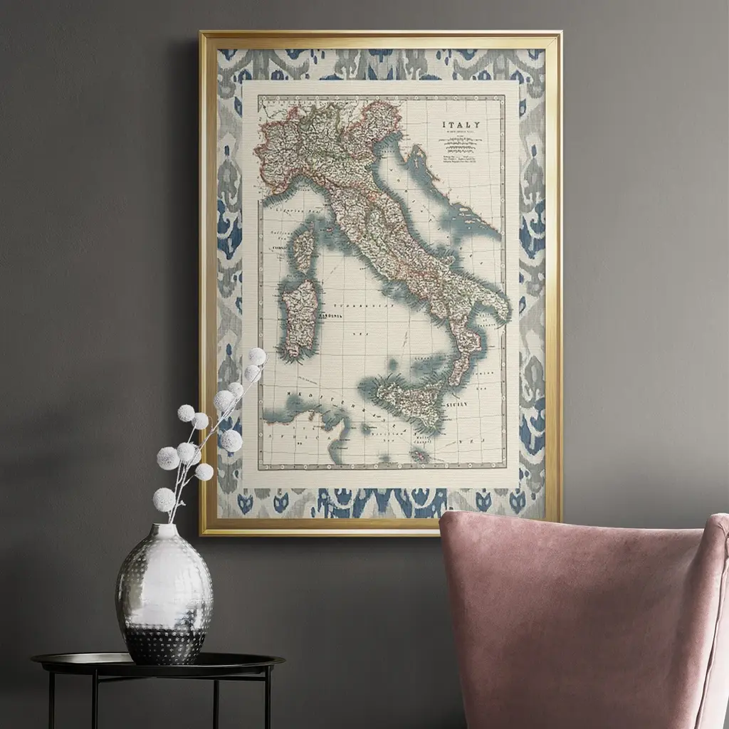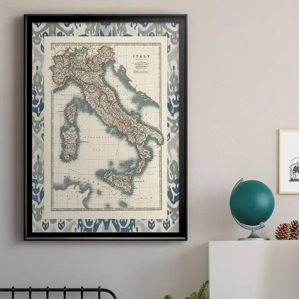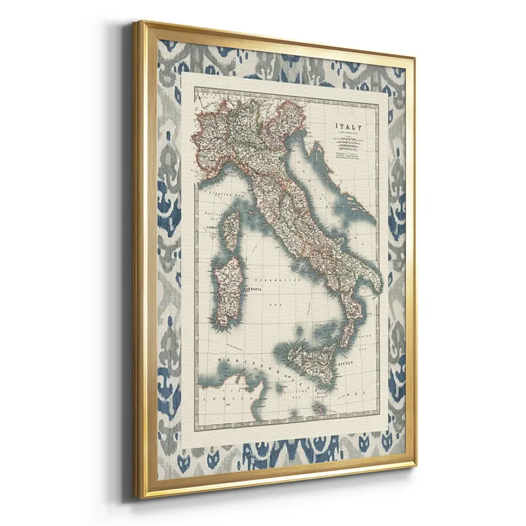 Bordered Map of Italy Premium Framed Print - Ready to Hang A Premium Framed Print created to last. Framed in distressed wood and available in an array of sizes and colors Featuring a beveled a solid wood stretcher bar, each piece comes ready to hand 4 SIZES AVAILABLE 30.5''X42.5'' - Overall Size 26.5'X36.5'' - Overall Size 22.5''x30.5'' - Overall Size 18.5''x24.5'' - Overall Size Each piece is made to order. Each piece comes with hanging hardware. Made in the USA Ready to Hang