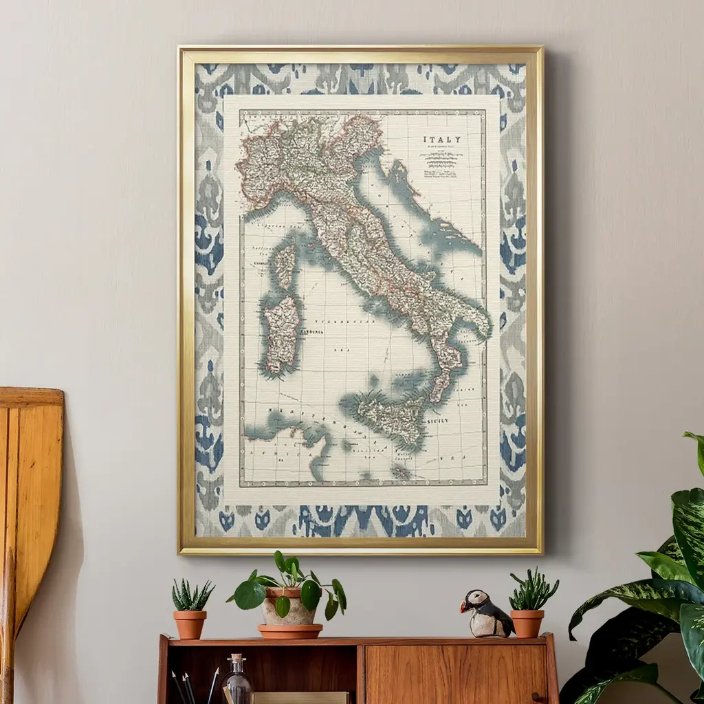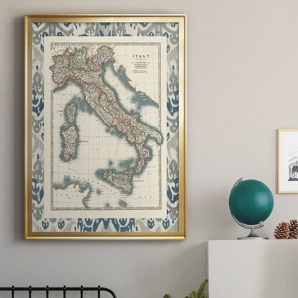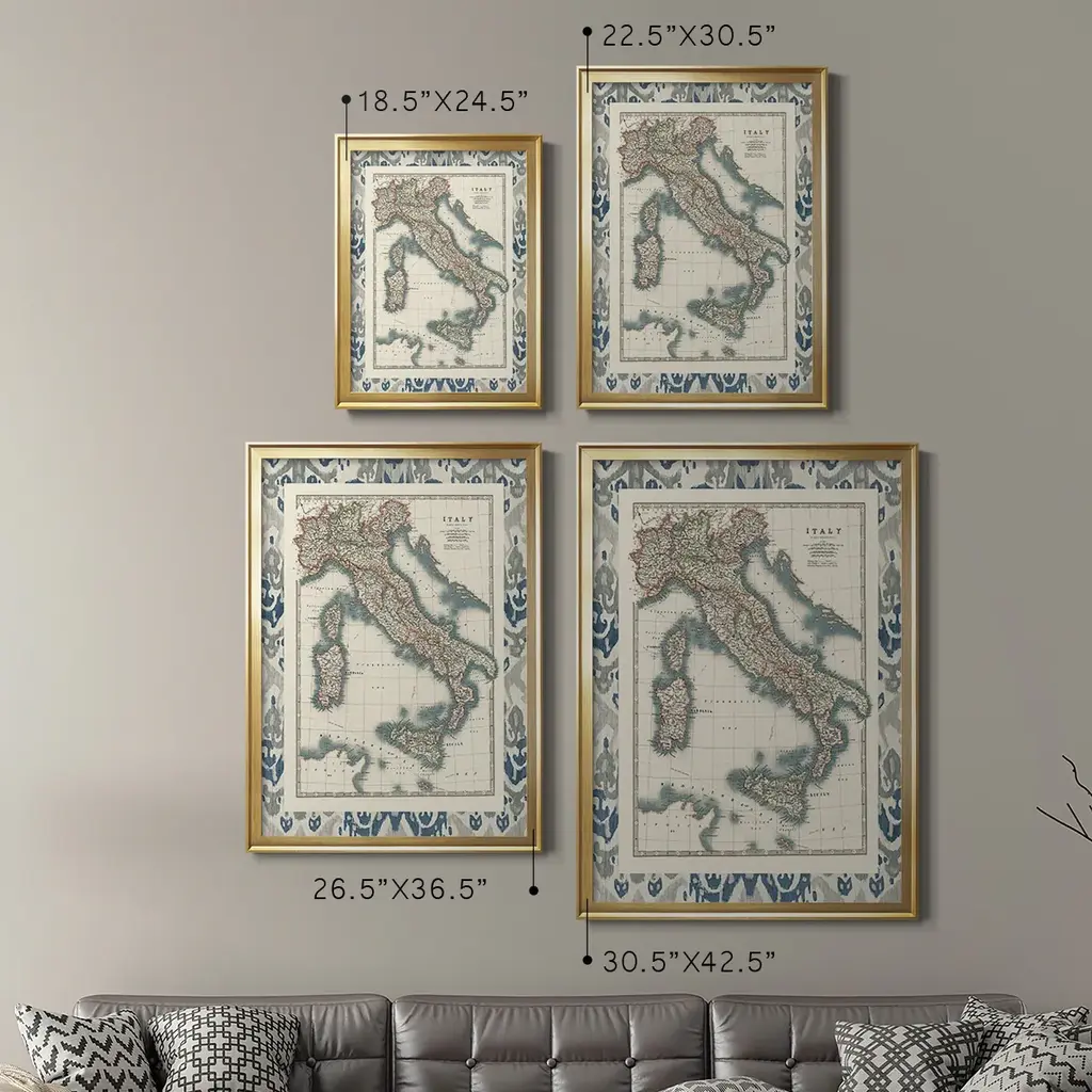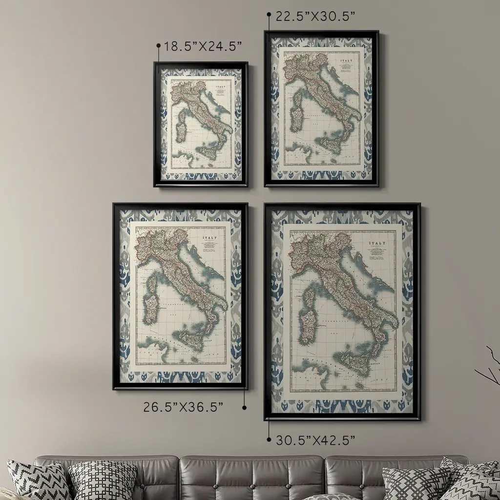 Bordered Map of Italy Premium Framed Print - Ready to Hang A Premium Framed Print created to last. Framed in distressed wood and available in an array of sizes and colors Featuring a beveled a solid wood stretcher bar, each piece comes ready to hand 4 SIZES AVAILABLE 30.5''X42.5'' - Overall Size 26.5'X36.5'' - Overall Size 22.5''x30.5'' - Overall Size 18.5''x24.5'' - Overall Size Each piece is made to order. Each piece comes with hanging hardware. Made in the USA Ready to Hang