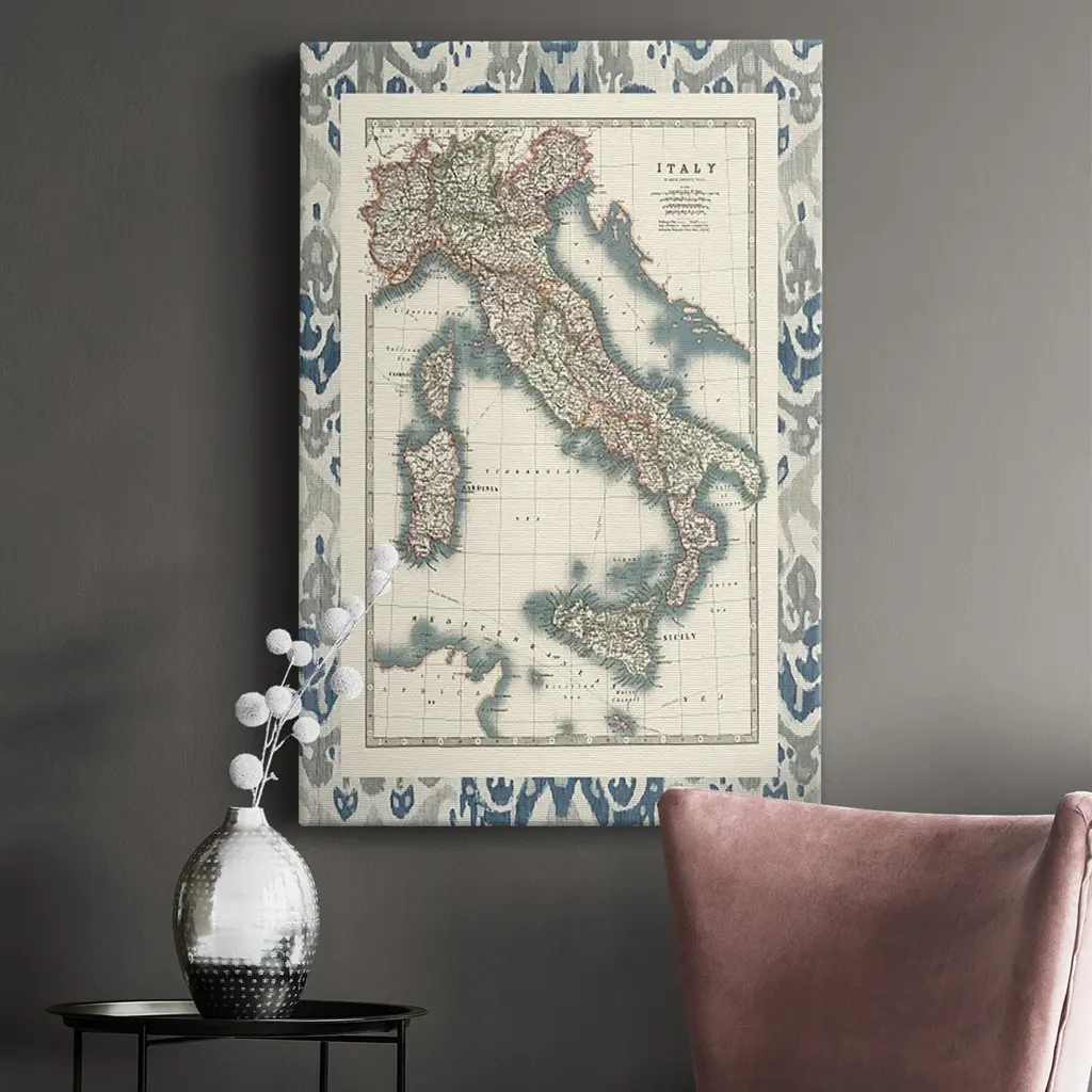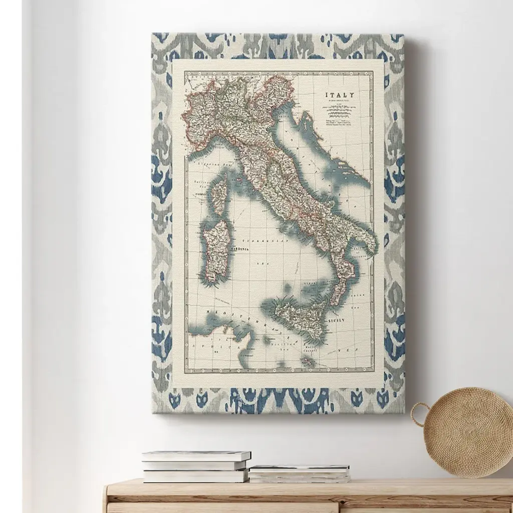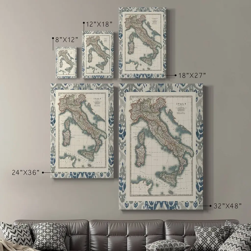 Bordered Map of Italy Premium Gallery Wrapped Canvas - Ready to Hang A premium hand stretched gallery wrapped canvas print created to last. Featuring a beveled a solid wood stretcher bar, each piece comes ready to hand 6 SIZES AVAILABLE 8''X12'' - Overall Size 12''X18'' - Overall Size 18''X27'' - Overall Size 24''x36'' - Overall Size 32''x48'' - Overall Size 40''x60'' - Overall Size Each piece is made to order. Built to Last Each piece comes ready to hang Solid wood stretcher Fade and Water resistant Made domestically