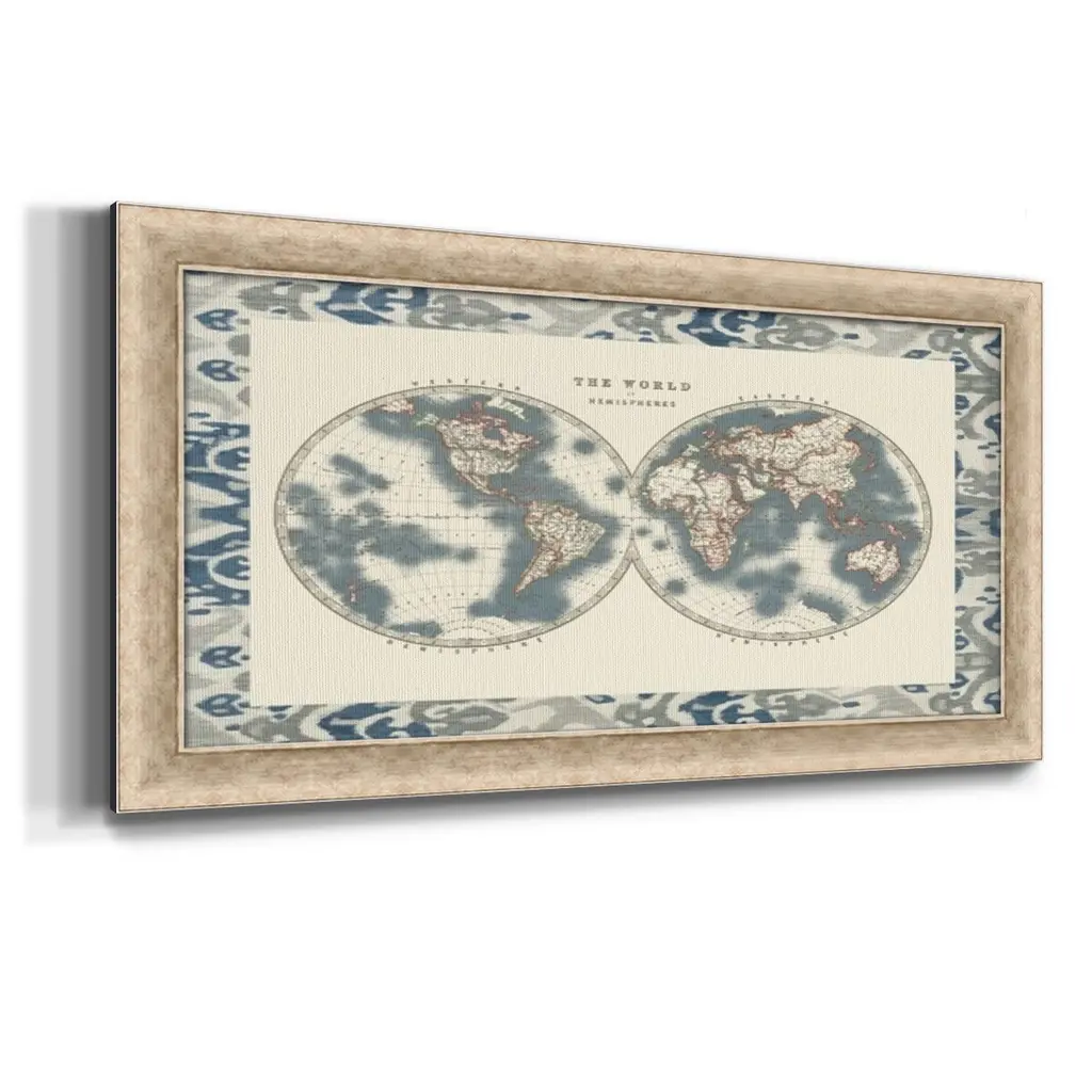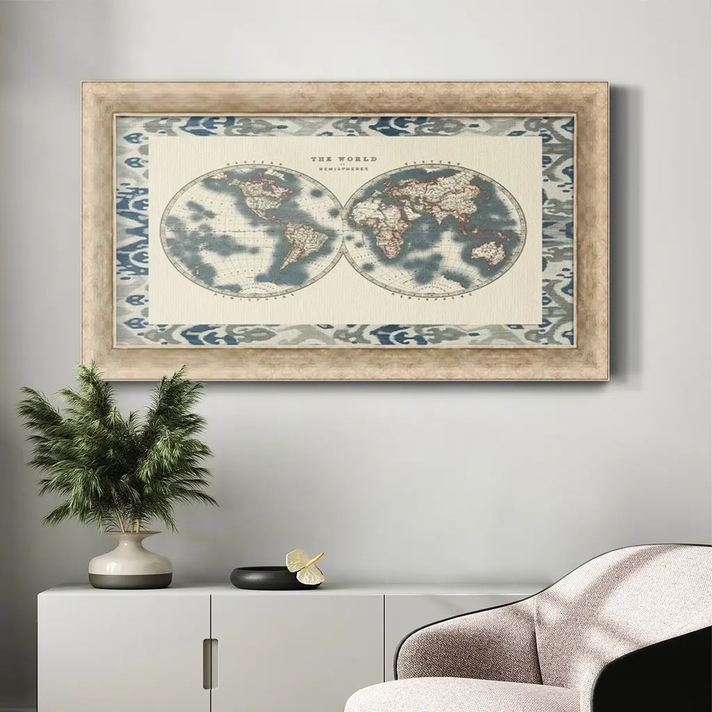 Bordered World Hemispheres Premium Framed Canvas- Ready to Hang A Premium Framed Canvas created to last. Framed in distressed wood and available in an array of sizes and colors Featuring a beveled a solid wood stretcher bar, each piece comes ready to hand 3 SIZES AVAILABLE 21''X37'' - Overall Size 25''X45'' - Overall Size 29''x53'' - Overall Size Each piece is made to order. Each piece comes with hanging hardware. Made in the USA Ready to Hang Giclee Paper Print Acrylic Glass Beveled Matt Board