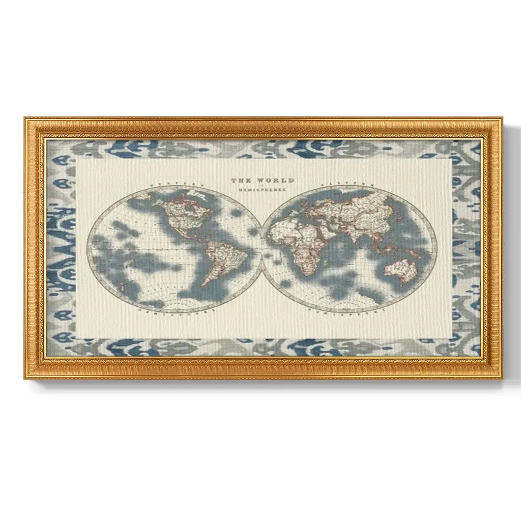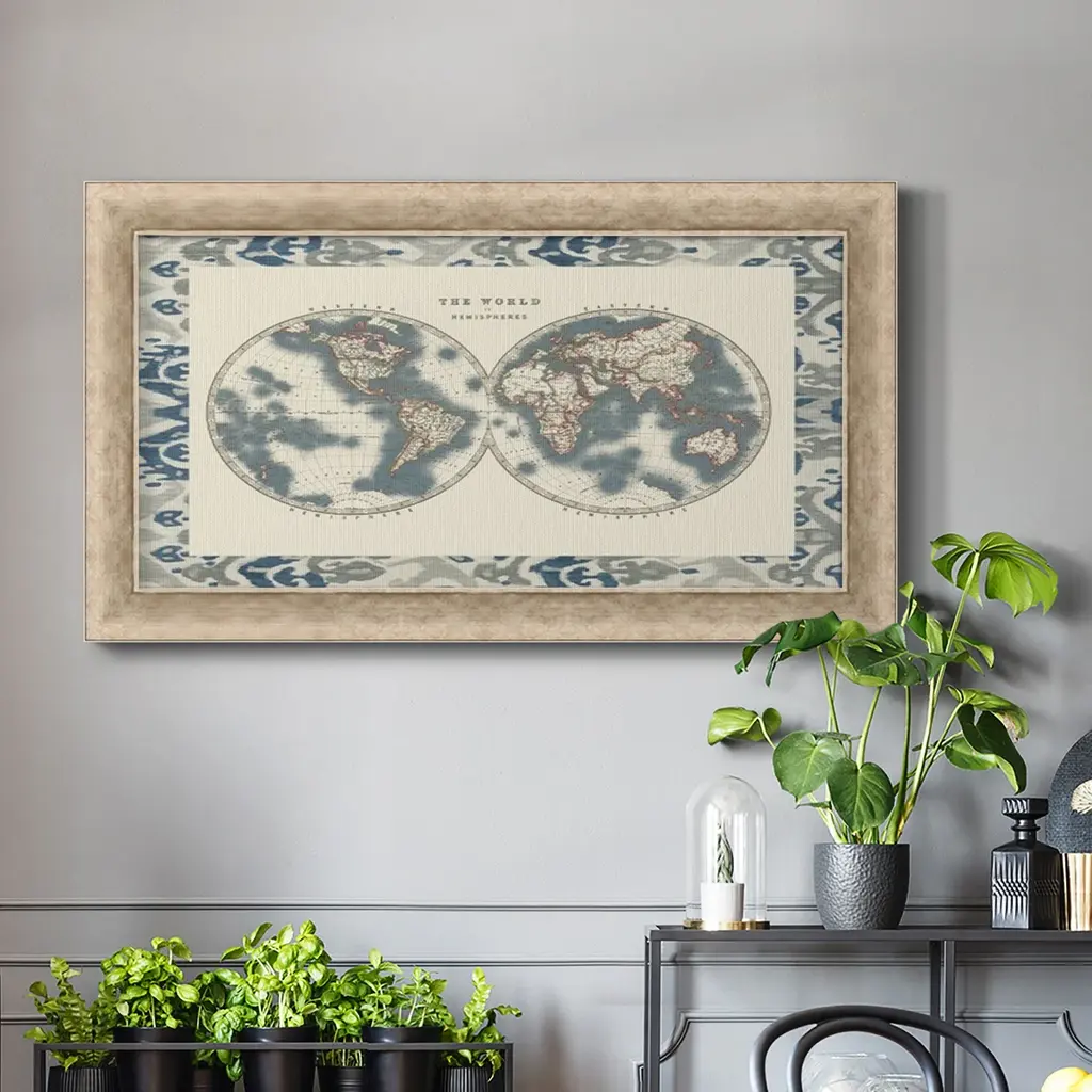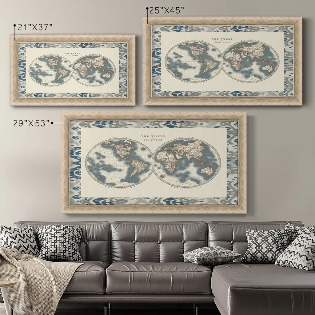 Bordered World Hemispheres Premium Framed Canvas- Ready to Hang A Premium Framed Canvas created to last. Framed in distressed wood and available in an array of sizes and colors Featuring a beveled a solid wood stretcher bar, each piece comes ready to hand 3 SIZES AVAILABLE 21''X37'' - Overall Size 25''X45'' - Overall Size 29''x53'' - Overall Size Each piece is made to order. Each piece comes with hanging hardware. Made in the USA Ready to Hang Giclee Paper Print Acrylic Glass Beveled Matt Board