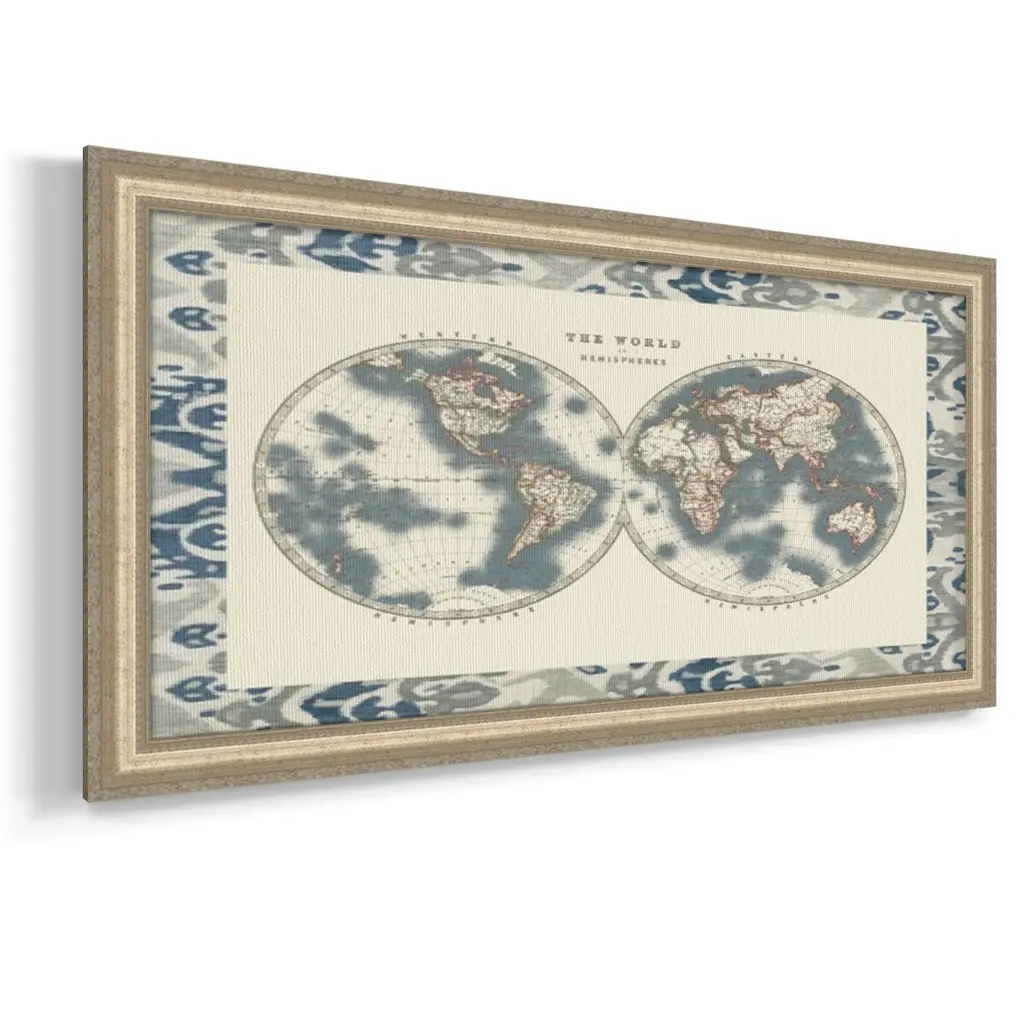 Bordered World Hemispheres Premium Framed Canvas- Ready to Hang A Premium Framed Canvas created to last. Framed in distressed wood and available in an array of sizes and colors Featuring a beveled a solid wood stretcher bar, each piece comes ready to hand 3 SIZES AVAILABLE 21''X37'' - Overall Size 25''X45'' - Overall Size 29''x53'' - Overall Size Each piece is made to order. Each piece comes with hanging hardware. Made in the USA Ready to Hang Giclee Paper Print Acrylic Glass Beveled Matt Board
