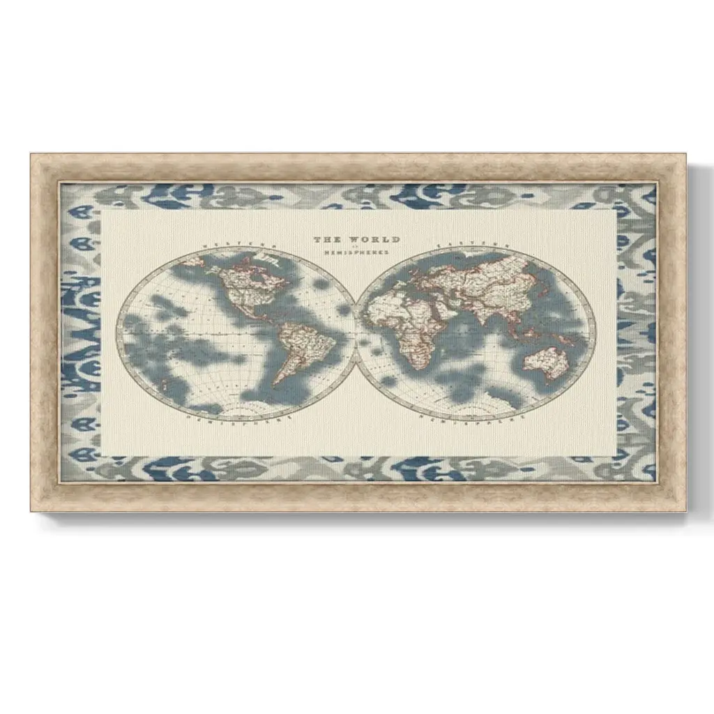 Bordered World Hemispheres Premium Framed Canvas- Ready to Hang A Premium Framed Canvas created to last. Framed in distressed wood and available in an array of sizes and colors Featuring a beveled a solid wood stretcher bar, each piece comes ready to hand 3 SIZES AVAILABLE 21''X37'' - Overall Size 25''X45'' - Overall Size 29''x53'' - Overall Size Each piece is made to order. Each piece comes with hanging hardware. Made in the USA Ready to Hang Giclee Paper Print Acrylic Glass Beveled Matt Board