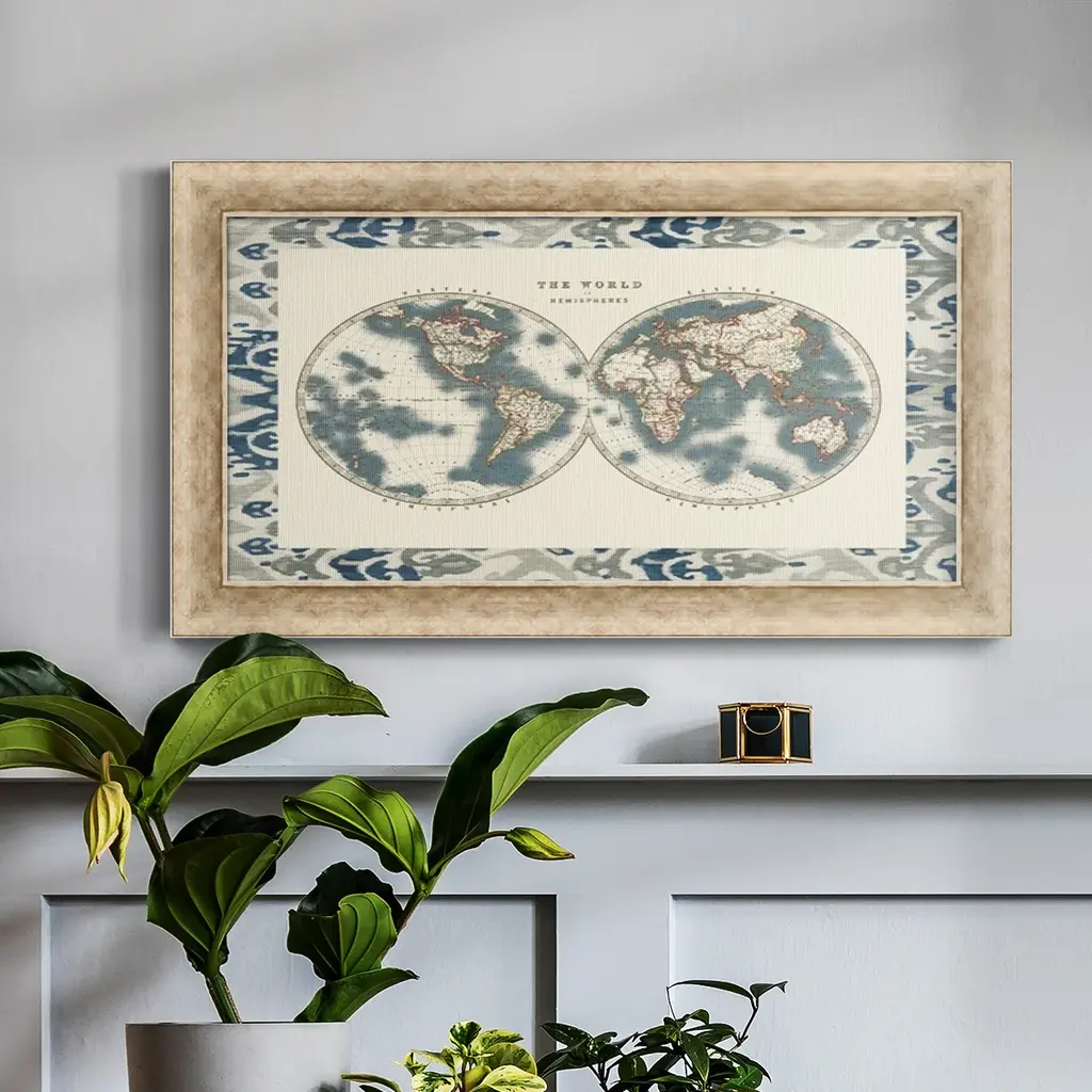Bordered World Hemispheres Premium Framed Canvas- Ready to Hang A Premium Framed Canvas created to last. Framed in distressed wood and available in an array of sizes and colors Featuring a beveled a solid wood stretcher bar, each piece comes ready to hand 3 SIZES AVAILABLE 21''X37'' - Overall Size 25''X45'' - Overall Size 29''x53'' - Overall Size Each piece is made to order. Each piece comes with hanging hardware. Made in the USA Ready to Hang Giclee Paper Print Acrylic Glass Beveled Matt Board