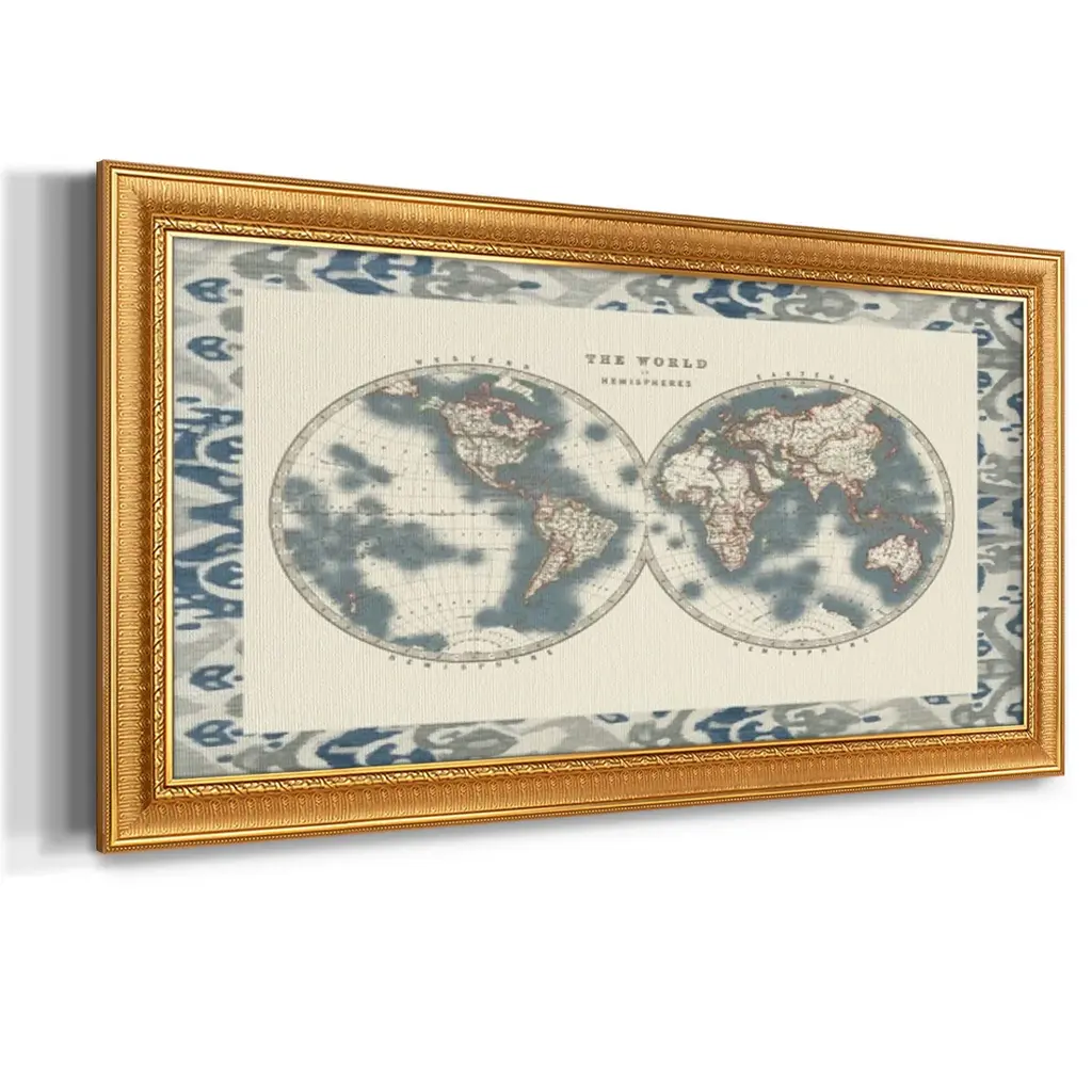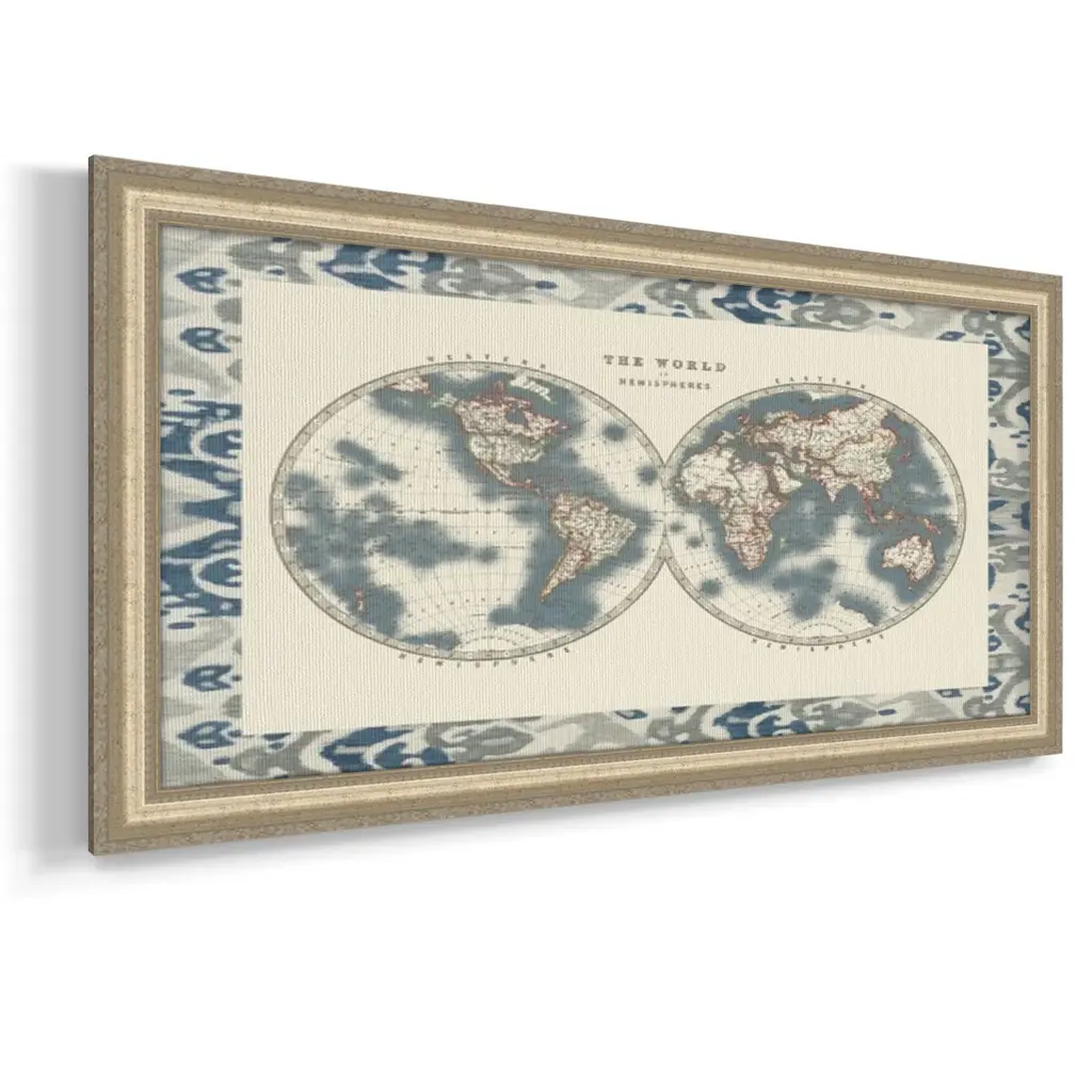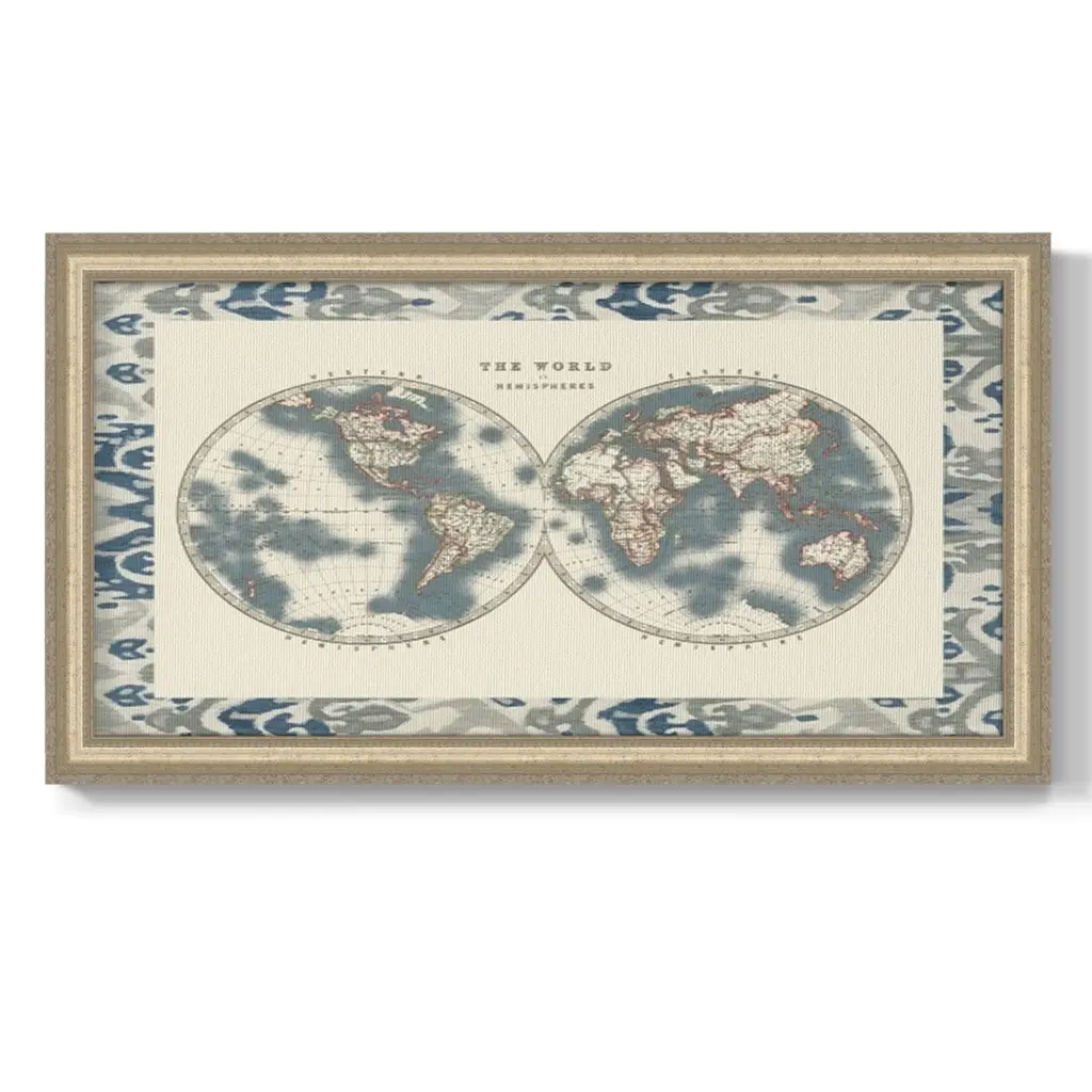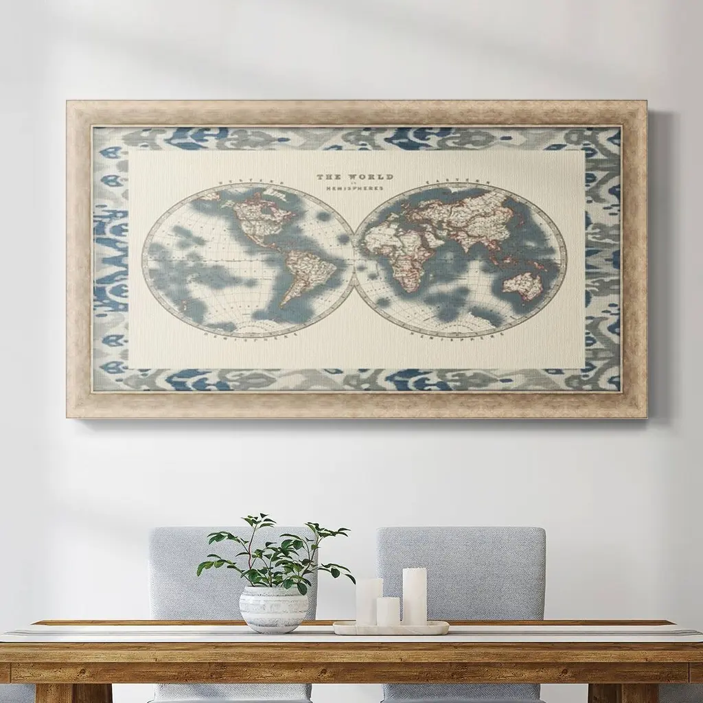 Bordered World Hemispheres Premium Framed Canvas- Ready to Hang A Premium Framed Canvas created to last. Framed in distressed wood and available in an array of sizes and colors Featuring a beveled a solid wood stretcher bar, each piece comes ready to hand 3 SIZES AVAILABLE 21''X37'' - Overall Size 25''X45'' - Overall Size 29''x53'' - Overall Size Each piece is made to order. Each piece comes with hanging hardware. Made in the USA Ready to Hang Giclee Paper Print Acrylic Glass Beveled Matt Board