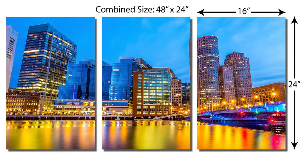 48"œ x 24"œ total size. Ready To Hang! (3 pieces - 16"œ x 24"œ each). 3 Panel Split (Triptych) Metal Print of Boston Harbor Financial District skyline in Massachusetts. Modern metal wall art for home or office wall decor & interior design. Printed on Luxurious, HD aluminum glossy metal panels. Multi panel art.. HD aluminum panels. Metal print wall art. Includes Shadow Wall Mount on the back.• Aluminum Metal Wall Art• Made in USA• Ready to hang - No assembly required• Shadow mount hardware on the back• 0.045"œ thick HD Aluminum Panels• Scratch resistant, glossy finish• Superb color clarity, luxurious prints• Epson printing process• For indoor or moisture rich environment use• Easy to clean. Gently wipe with microfiber cloth.