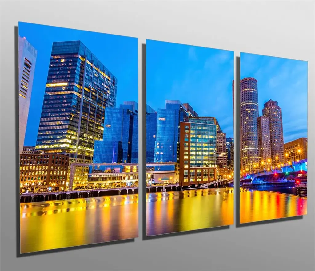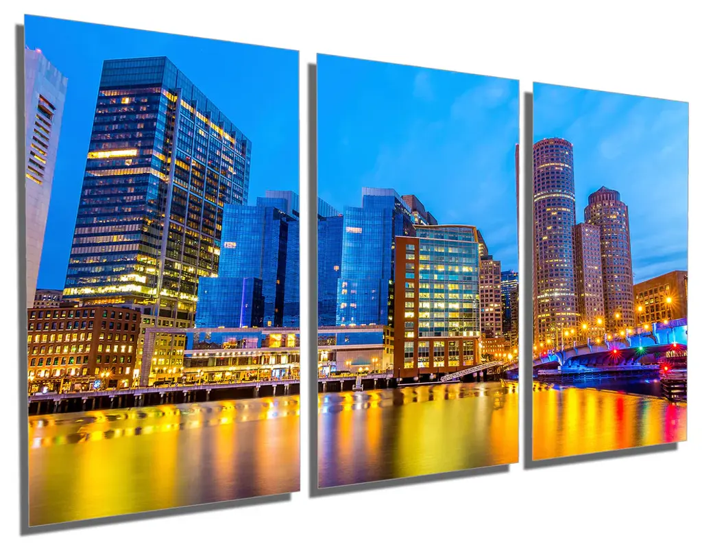 72"œ x 36"œ total size. Ready To Hang! (3 pieces - 24"œ x 36"œ each). 3 Panel Split (Triptych) Metal Print of Boston Harbor Financial District skyline in Massachusetts. Modern metal wall art for home or office wall decor & interior design. Printed on Luxurious, HD aluminum glossy metal panels. Multi panel art.. HD aluminum panels. Metal print wall art. Includes Shadow Wall Mount on the back.• Aluminum Metal Wall Art• Made in USA• Ready to hang - No assembly required• Shadow mount hardware on the back• 0.045"œ thick HD Aluminum Panels• Scratch resistant, glossy finish• Superb color clarity, luxurious prints• Epson printing process• For indoor or moisture rich environment use• Easy to clean. Gently wipe with microfiber cloth.