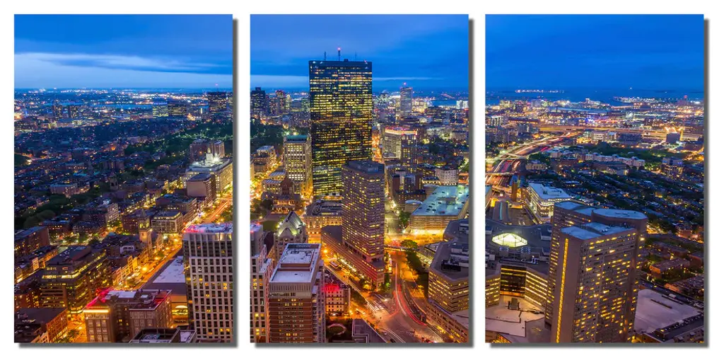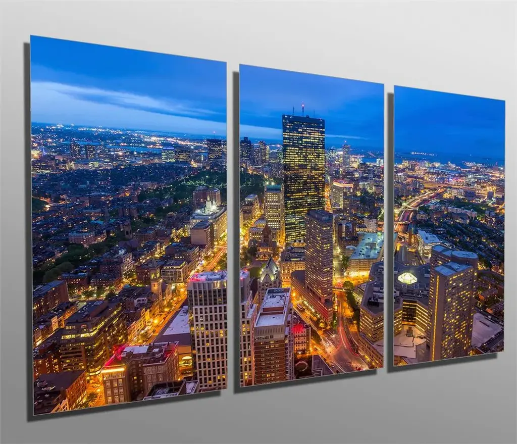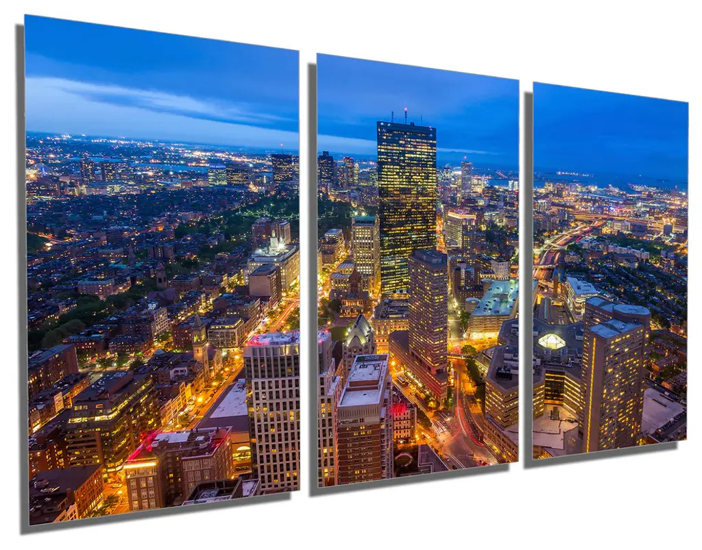 36"œ x 18"œ total size. Ready To Hang! (3 pieces - 12"œ x 18"œ each). 3 Panel Split (Triptych) Metal Print of Boston City Skyline at dusk. Modern metal wall art for home or office wall decor & interior design. Printed on Luxurious, HD aluminum glossy metal panels. Multi panel art.. HD aluminum panels. Metal print wall art. Includes Shadow Wall Mount on the back.• Aluminum Metal Wall Art• Made in USA• Ready to hang - No assembly required• Shadow mount hardware on the back• 0.045"œ thick HD Aluminum Panels• Scratch resistant, glossy finish• Superb color clarity, luxurious prints• Epson printing process• For indoor or moisture rich environment use• Easy to clean. Gently wipe with microfiber cloth.
