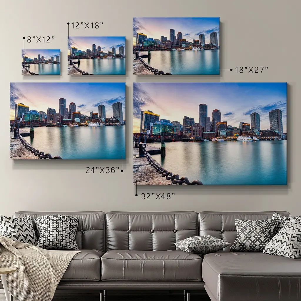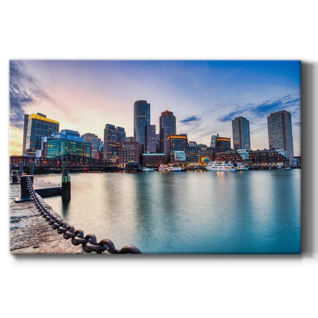 Boston Skyline with Financial District and Boston Harbor at Sunset Premium Gallery Wrapped Canvas - Ready to Hang A premium hand stretched gallery wrapped canvas print created to last. Featuring a beveled a solid wood stretcher bar, each piece comes ready to hand 6 SIZES AVAILABLE 8''X12'' - Overall Size 12''X18'' - Overall Size 18''X27'' - Overall Size 24''x36'' - Overall Size 32''x48'' - Overall Size 40''x60'' - Overall Size Each piece is made to order. Built to Last Each piece comes ready to hang Solid wood stretcher Fade and Water resistant Made domestically