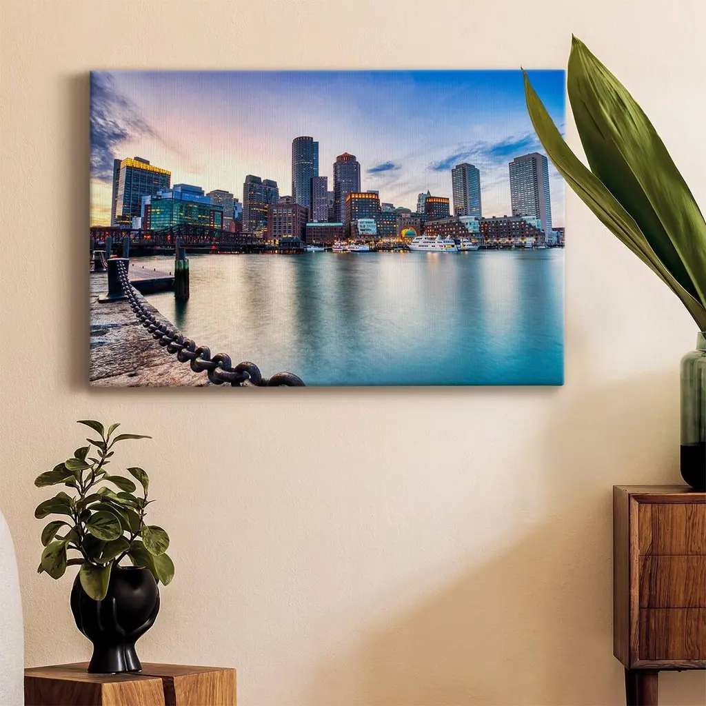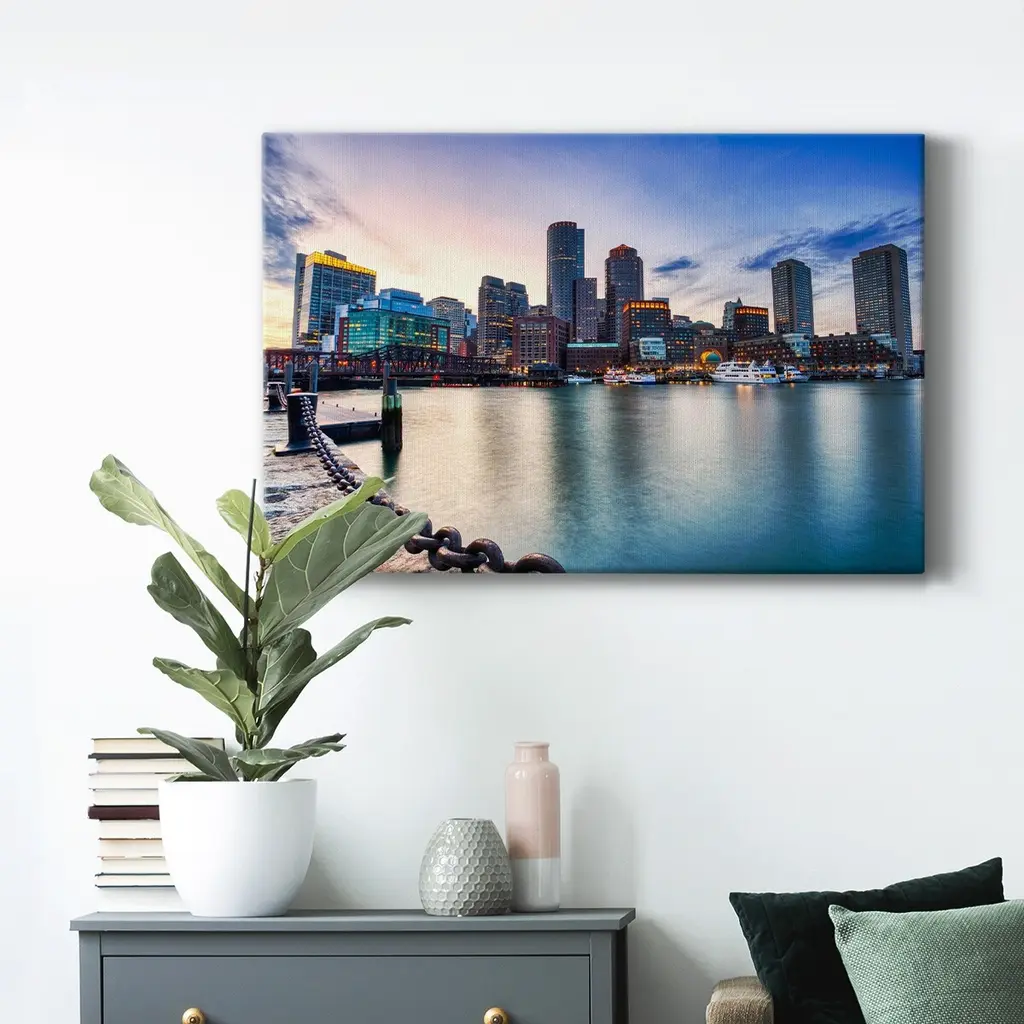 Boston Skyline with Financial District and Boston Harbor at Sunset Premium Gallery Wrapped Canvas - Ready to Hang A premium hand stretched gallery wrapped canvas print created to last. Featuring a beveled a solid wood stretcher bar, each piece comes ready to hand 6 SIZES AVAILABLE 8''X12'' - Overall Size 12''X18'' - Overall Size 18''X27'' - Overall Size 24''x36'' - Overall Size 32''x48'' - Overall Size 40''x60'' - Overall Size Each piece is made to order. Built to Last Each piece comes ready to hang Solid wood stretcher Fade and Water resistant Made domestically