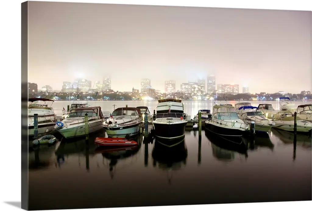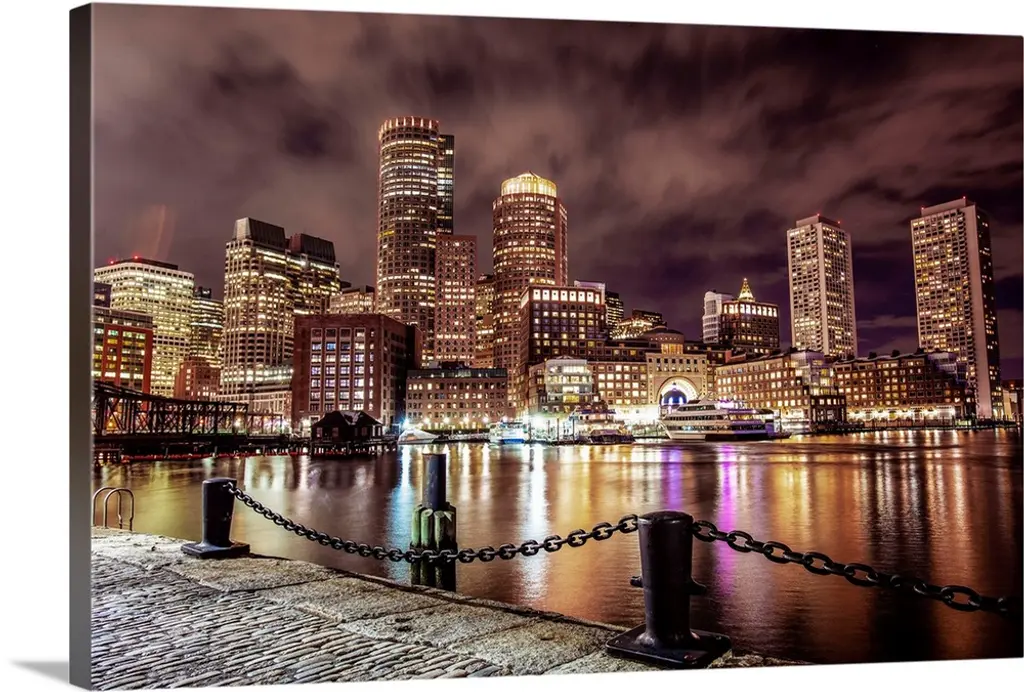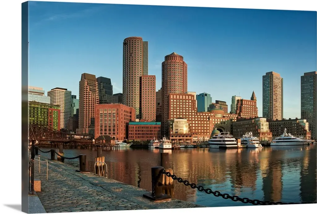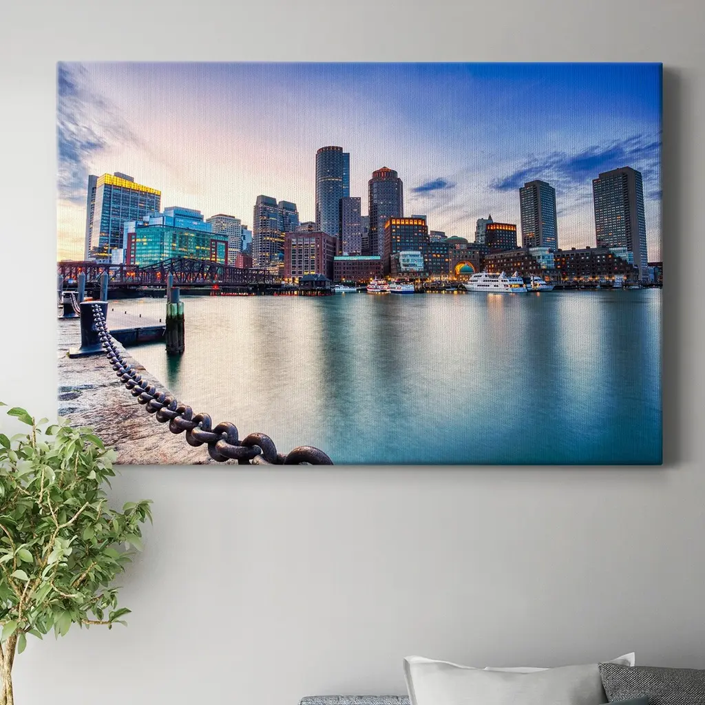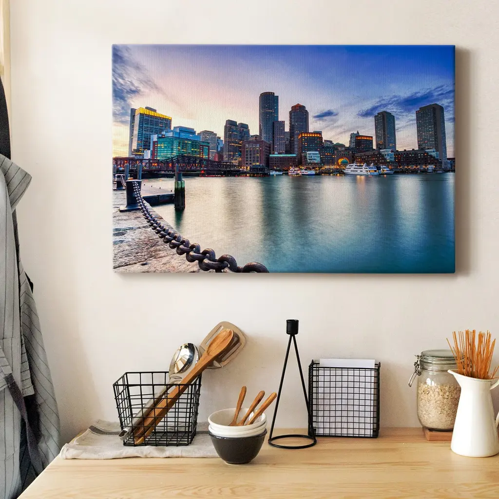Boston Skyline with Financial District and Boston Harbor at Sunset Premium Gallery Wrapped Canvas - Ready to Hang A premium hand stretched gallery wrapped canvas print created to last. Featuring a beveled a solid wood stretcher bar, each piece comes ready to hand 6 SIZES AVAILABLE 8''X12'' - Overall Size 12''X18'' - Overall Size 18''X27'' - Overall Size 24''x36'' - Overall Size 32''x48'' - Overall Size 40''x60'' - Overall Size Each piece is made to order. Built to Last Each piece comes ready to hang Solid wood stretcher Fade and Water resistant Made domestically