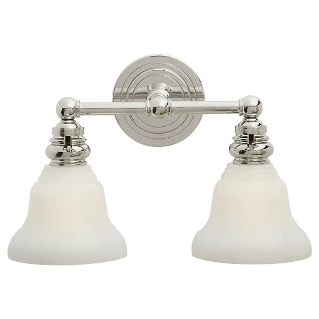 With its upscale design and warm ambient lighting, the Boston Vanity Light by Visual Comfort Signature, formerly known as Visual Comfort, is an ideal fit for decorative bathroom settings. This impressionable piece consists of a sleek, metal wallplate, dramatically angled stems, and lavish metal holders, which work together to create an image of both luxury and function. Available in a variety of finishes, shade options, and fixture quantities (number of lights) to ensure the right fit for your personal space.