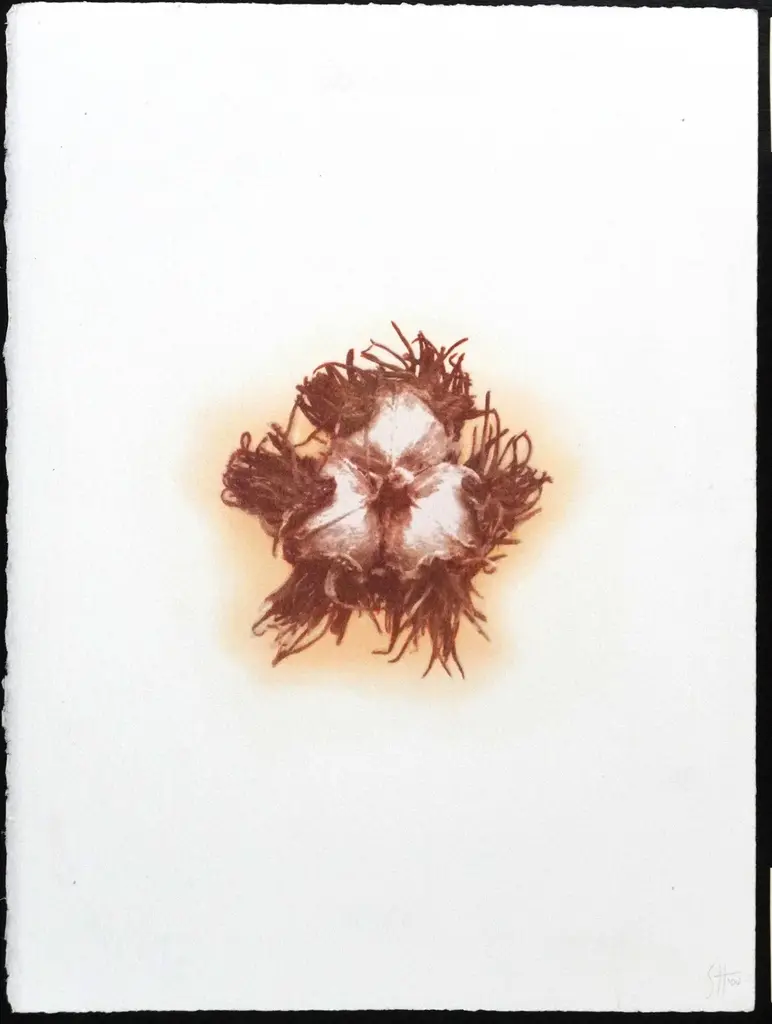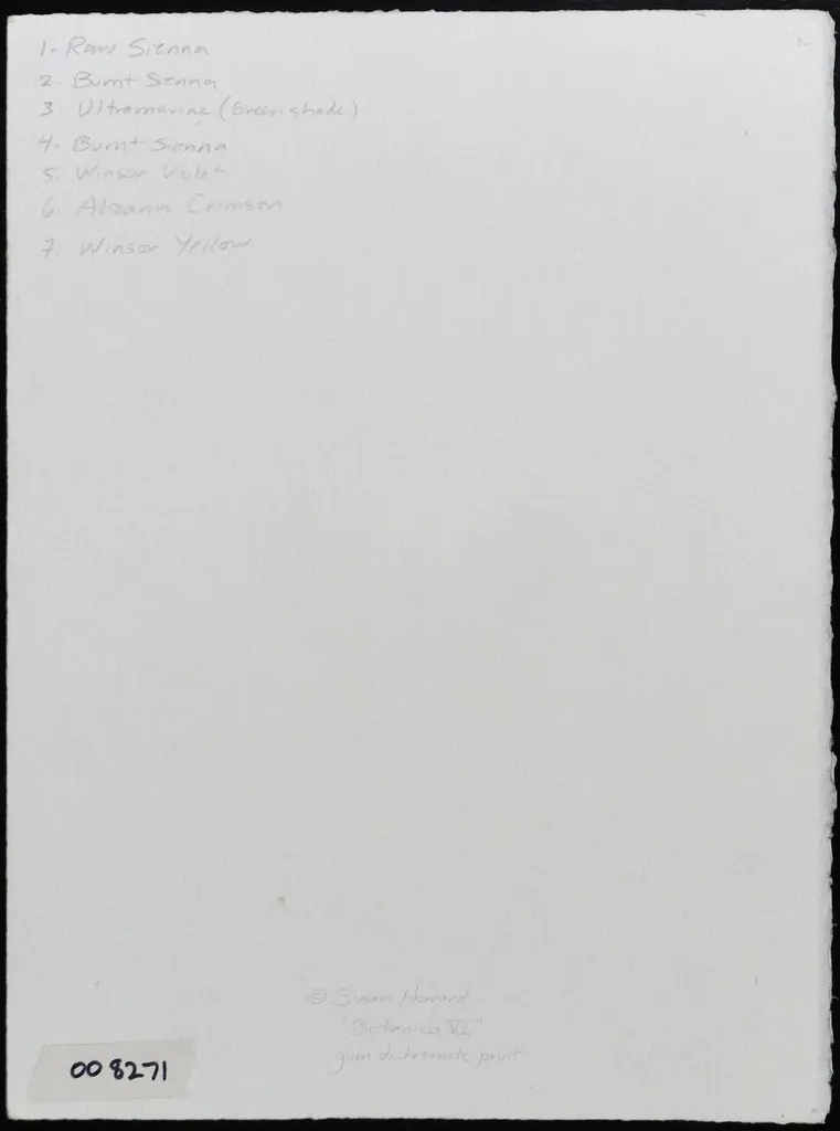 "Botanica VI" is a gum-dichromate print. This photography process goes back to the 1850. In brief, hand made paper is coated with pigment that has been light-sensitized with dichromate, layered with a negative, and then exposed to a light source. In this case many repeated exposures with multiple negatives deepen and enrich its tones. The completed image has a closer resemblance to a watercolor painting than to a conventional photograph. Each print is unique and archival. S. Howard, a Bay Area artist, graduated from the San Francisco Art Institute in 1974 and has a fondness for old processi. This print 15" x 11". There are 4 unique prints available.
