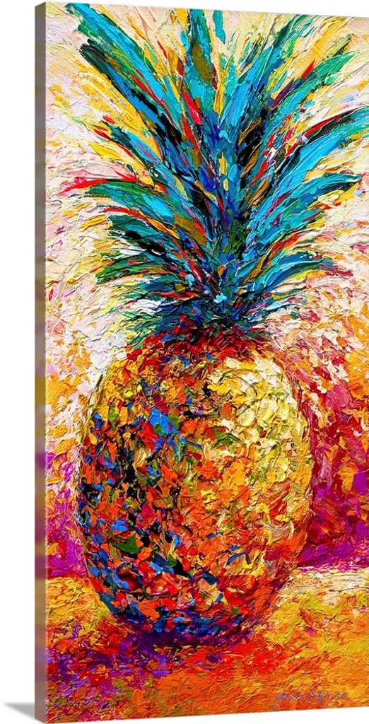 Contemporary painting of a pineapple in its natural state, growing out of the ground, with long leaves underneath.