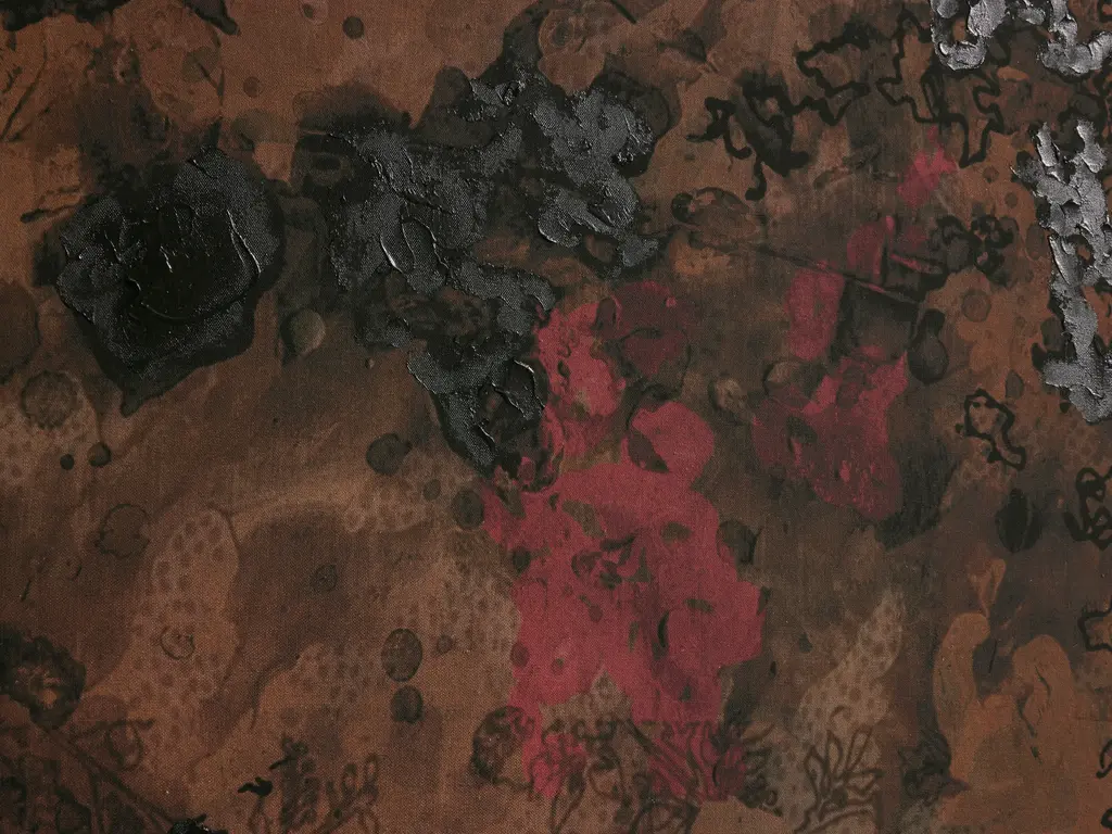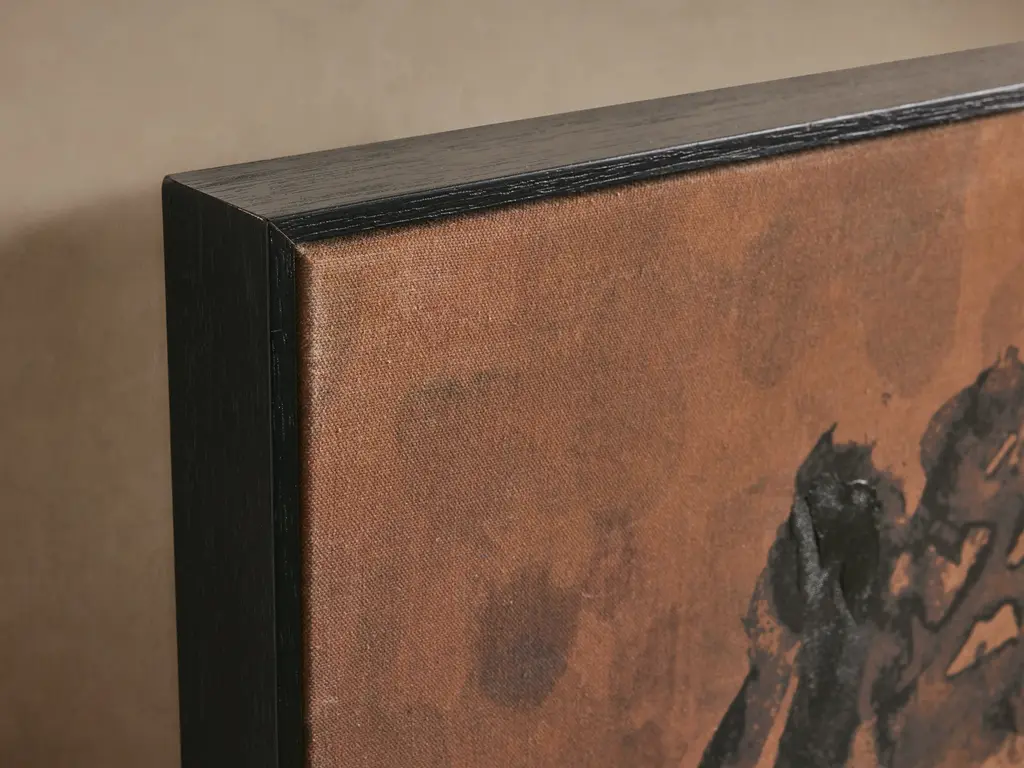 Featuring organic shapes reminiscent of flora, Botanical Shadows captures movement through a striking scene with pops of red among petals of brown and black hues. Gallery-wrapped giclee print on canvas surrounded by an espresso brown-finished wood frame. Hangs vertically from back-mounted D-rings.