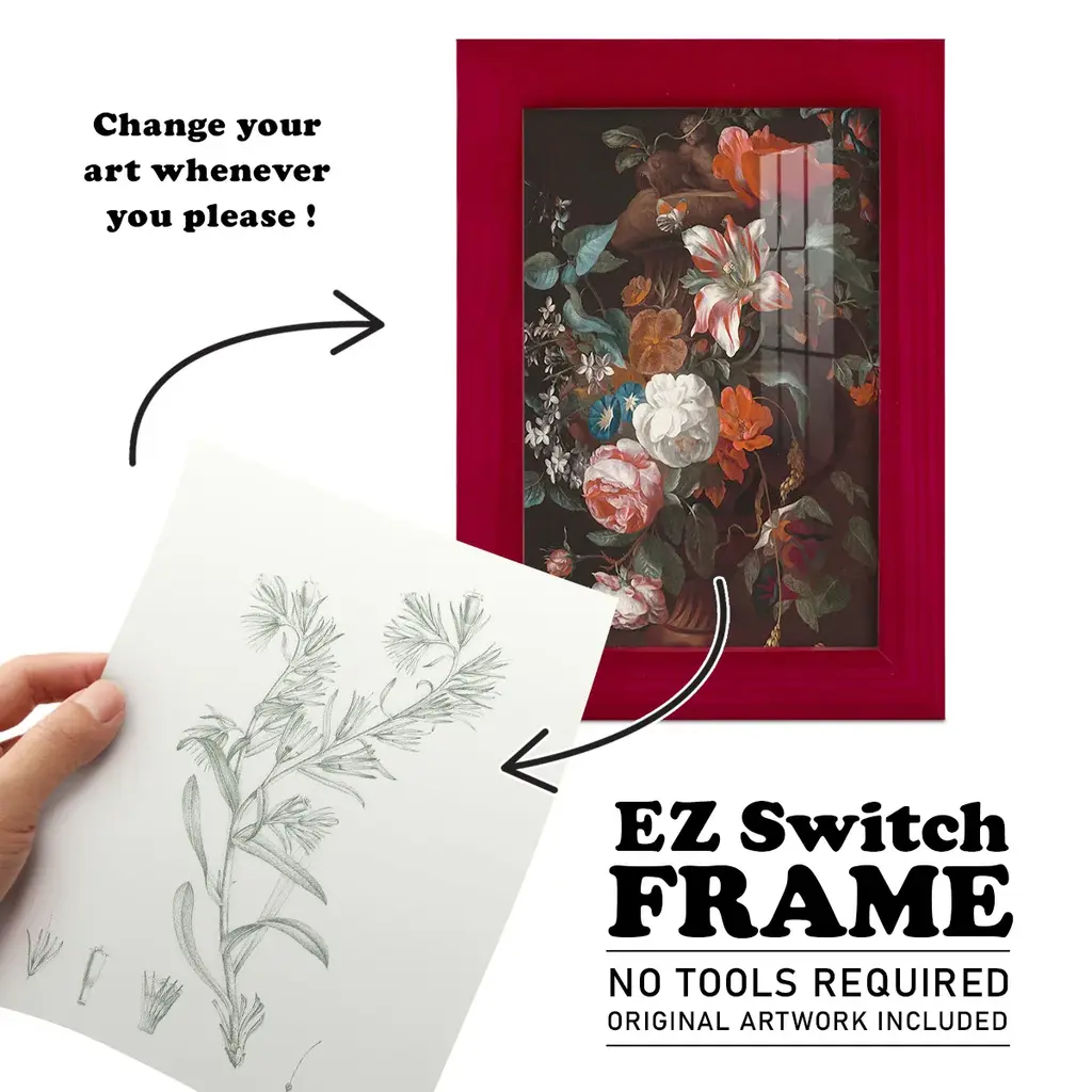 Botanical Study in Sage II -EZ SWITCH Framed Print w/glass-Cherry Red A delightful, framed print. Featuring a solid wood frame with real wood glass. This premium print is giclee quality. In addition, every frame features a removable back and table top stand. This allows you to change your art in the future or to just stand the art on a table for a new look. We are sure you'll enjoy our new series of EZ SWITCH Framed Art. Solid Wood Frame Real Glass Removable / Replaceable Art Built in Tabletop Stand Sizes range from 4x6 up to 12x15 - buy just one or pair them up as sets as you see fit.
