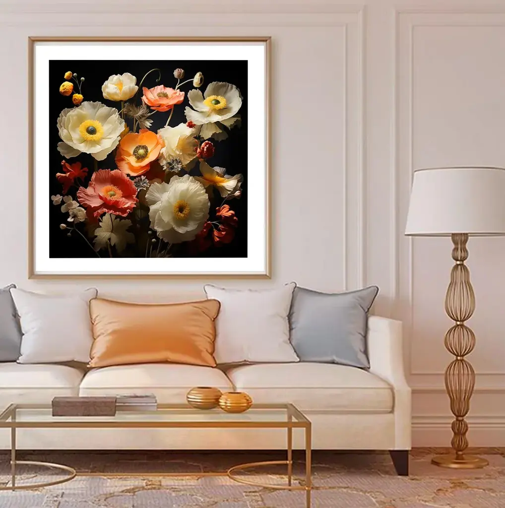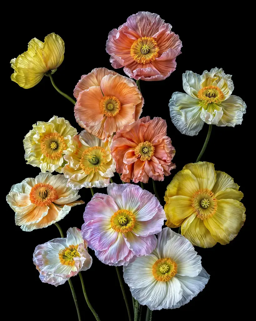 A photograph of several colorful lily's and daisy's against black. Printed on Archival Fine Art Paper.