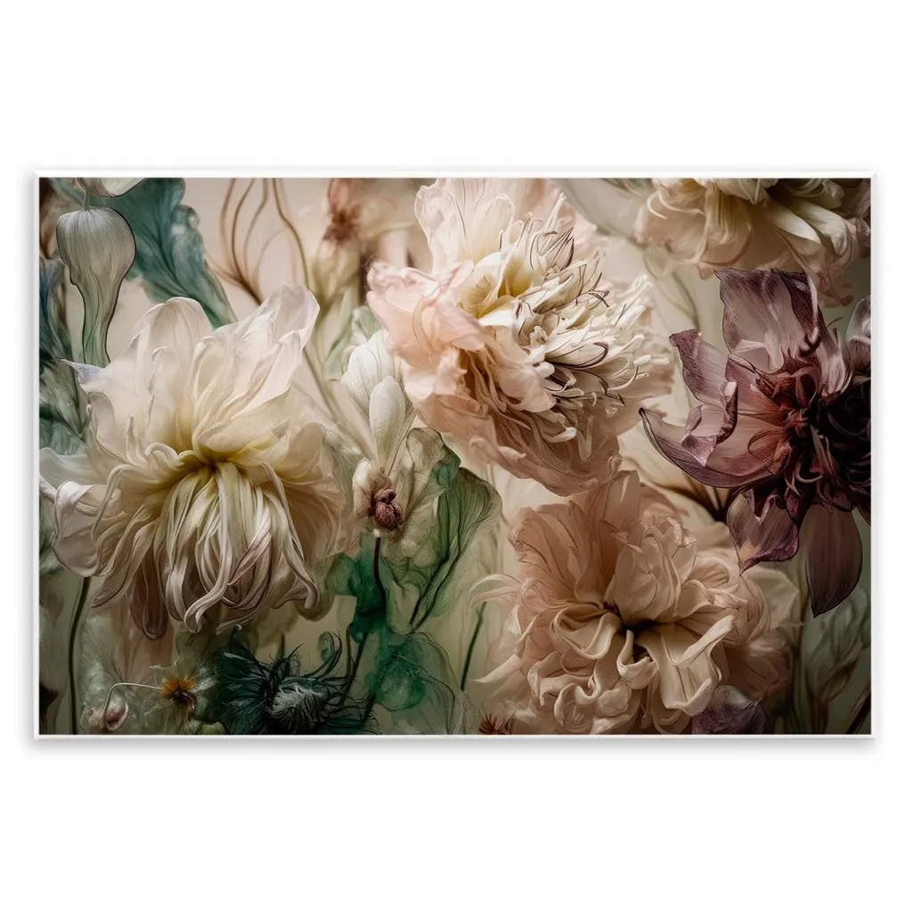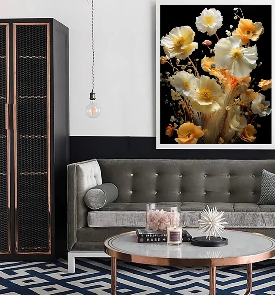 A photograph of several colorful lily's and daisy's against black.Printed on 300gsm Archival Fine Art Paper.