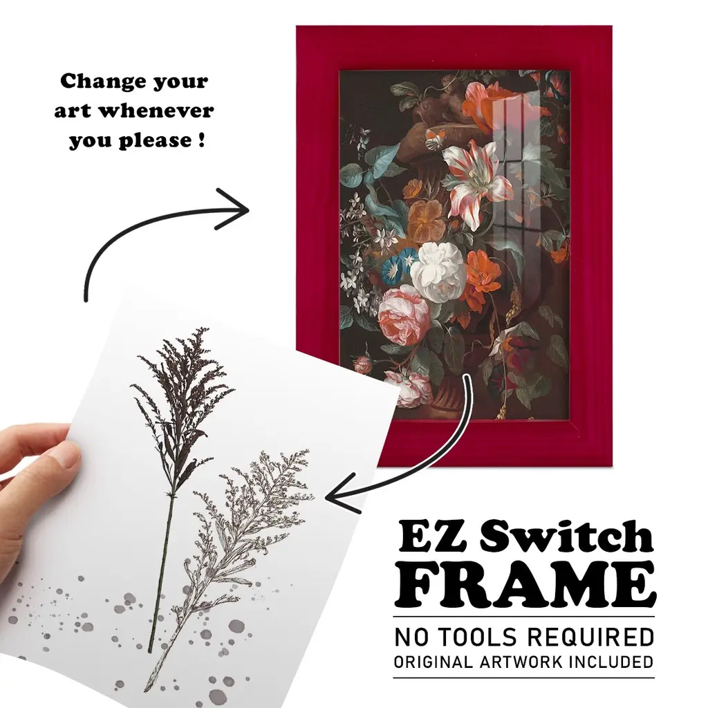 Botany Flower VI -EZ SWITCH Framed Print w/glass-Cherry Red A delightful, framed print. Featuring a solid wood frame with real wood glass. This premium print is giclee quality. In addition, every frame features a removable back and table top stand. This allows you to change your art in the future or to just stand the art on a table for a new look. We are sure you'll enjoy our new series of EZ SWITCH Framed Art. Solid Wood Frame Real Glass Removable / Replaceable Art Built in Tabletop Stand Sizes range from 4x6 up to 12x15 - buy just one or pair them up as sets as you see fit.