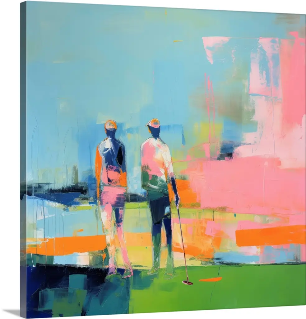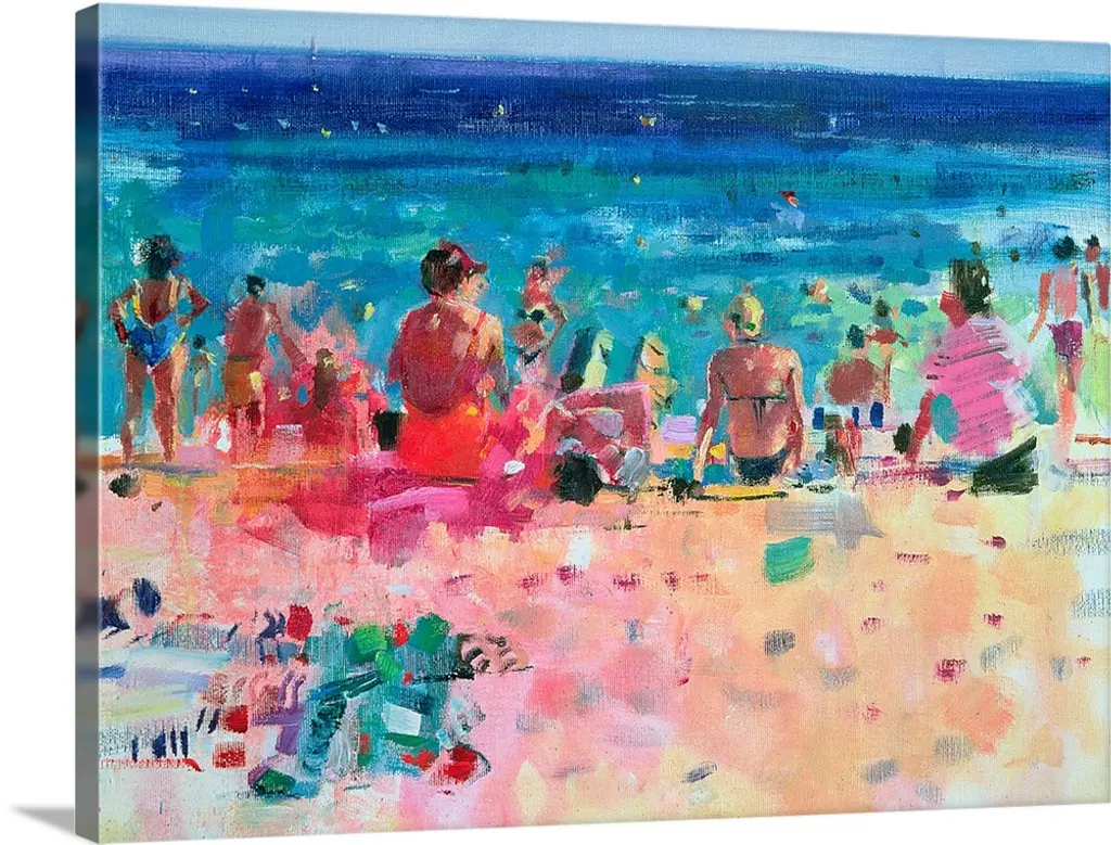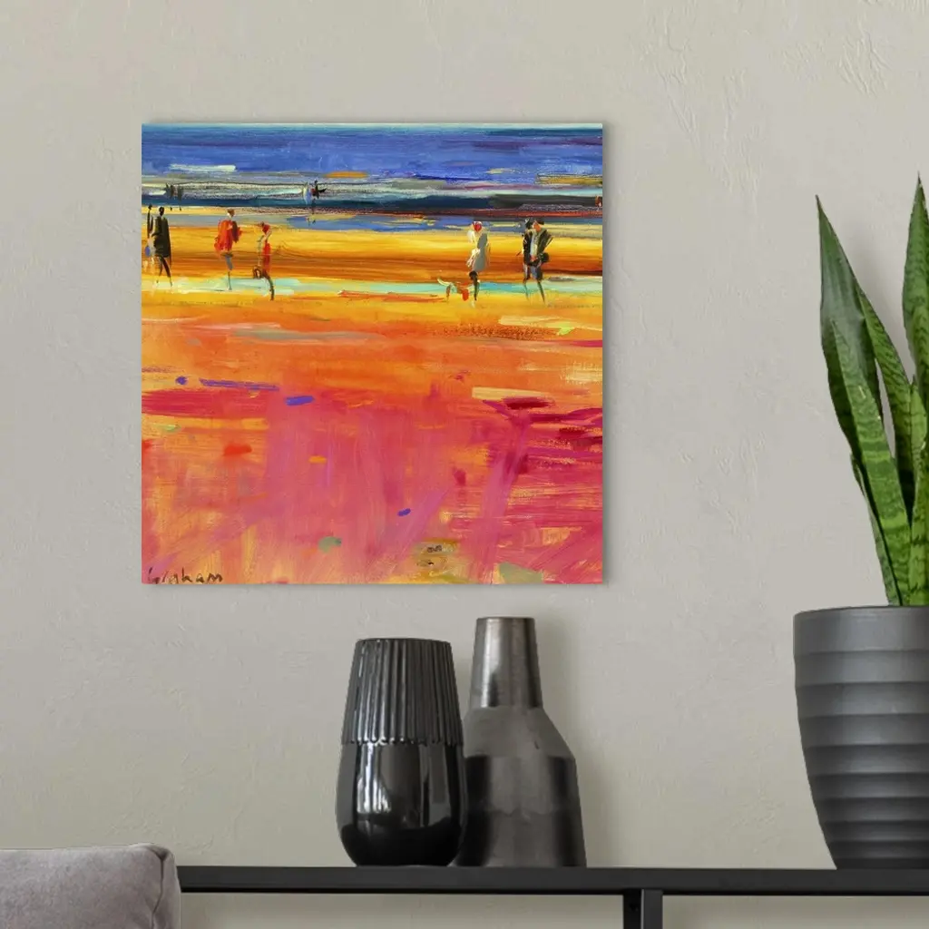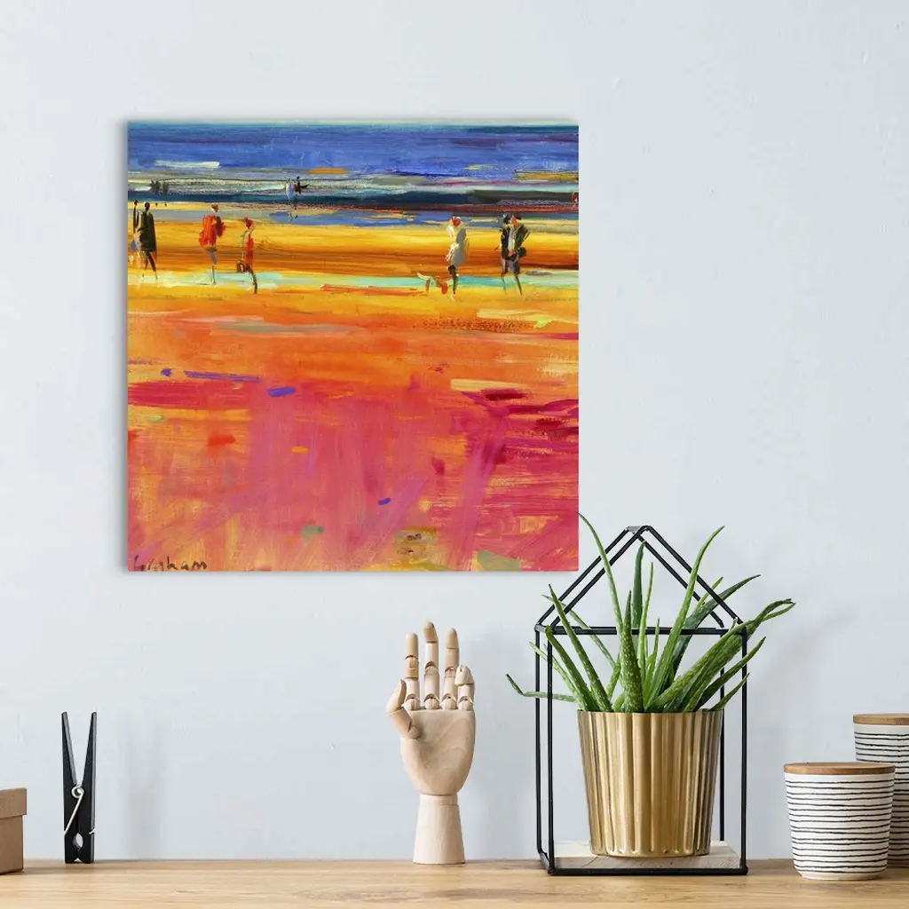Square abstract painting of people walking on a beach with the ocean in a distance.