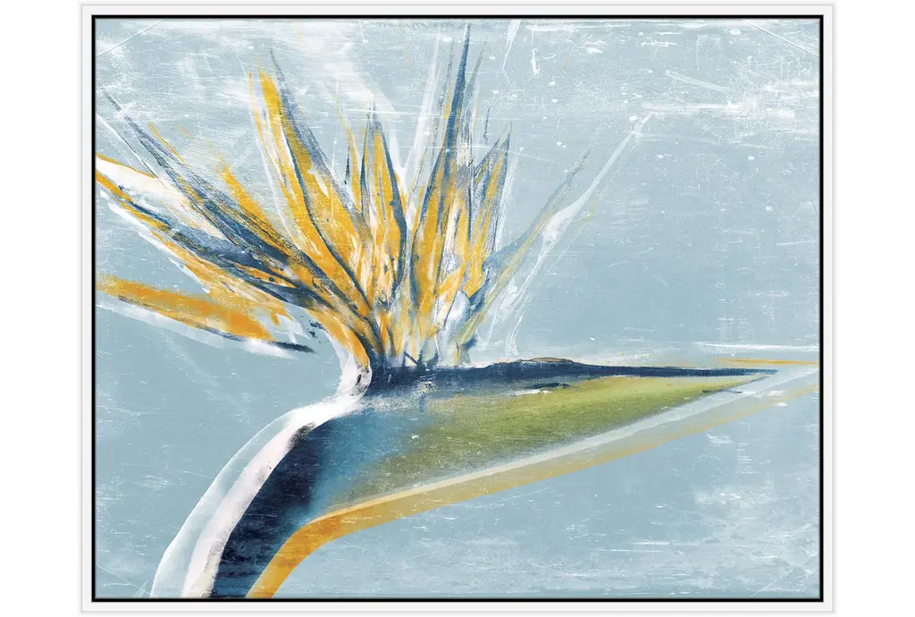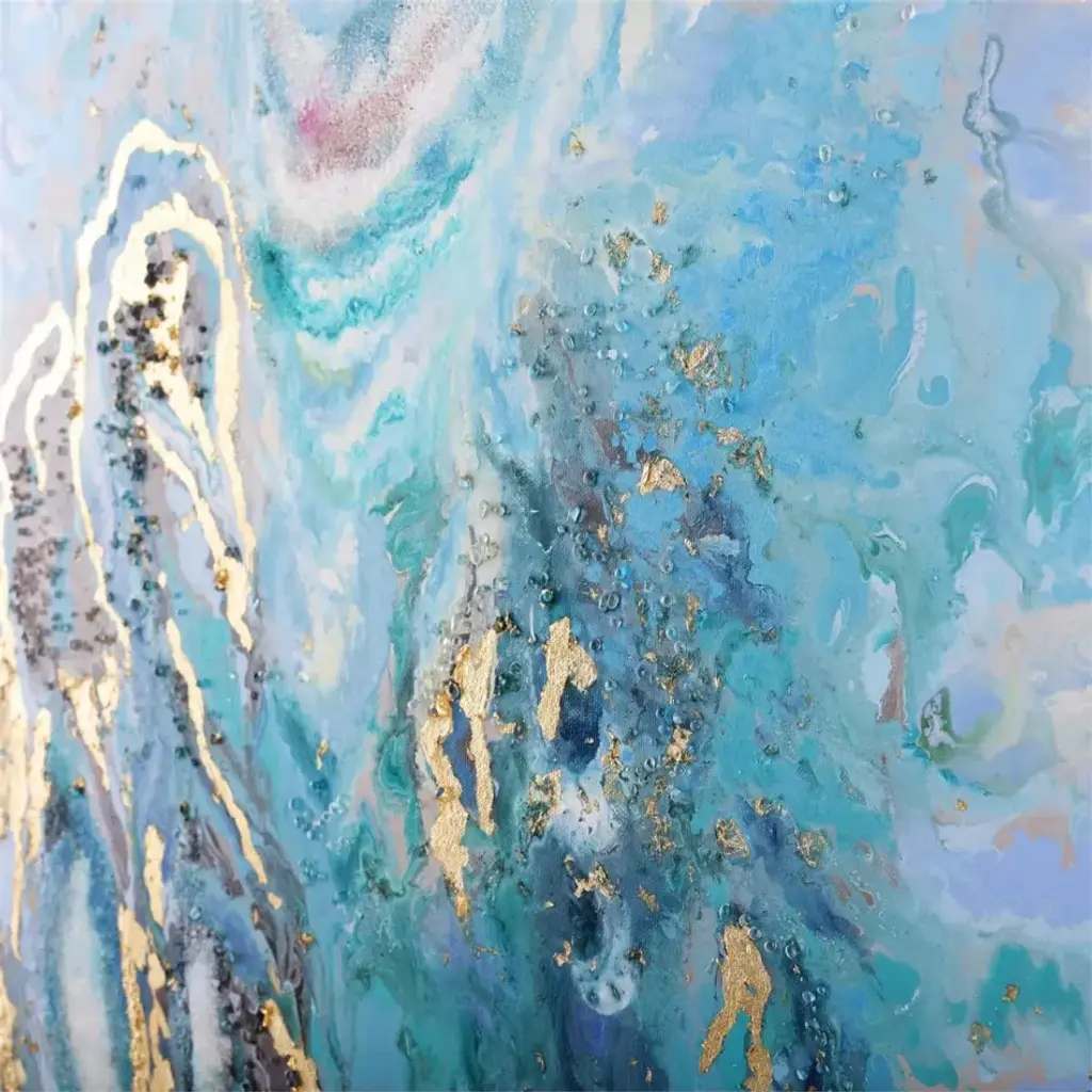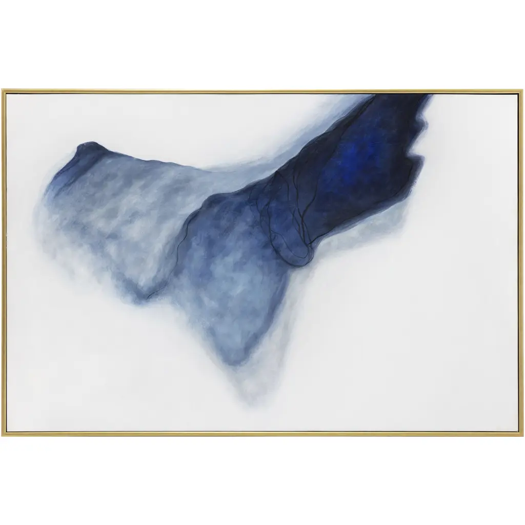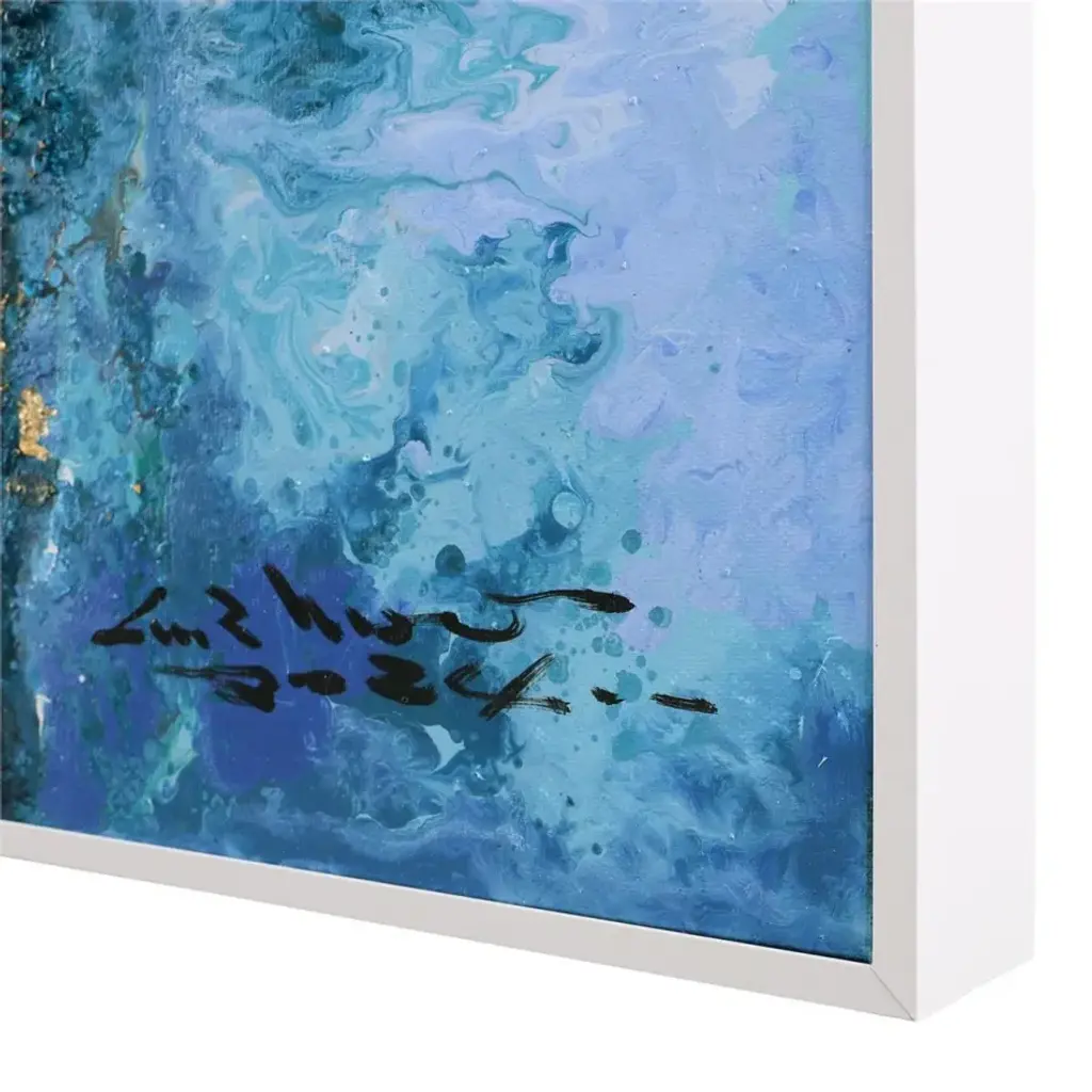 Boundless Horizons is a magnificent oil painting on canvas that elevates an interior space through mesmerizing patterns and a rich sense of motion. Delicate shades of blue and green augmented with traces of gold leaf blend with pristine whites and misty grays to create a spiraling cloudscape. Textural beads have been applied to the surface, contributing additional dimension to complete the look. The piece is held within a white aluminum gallery frame.