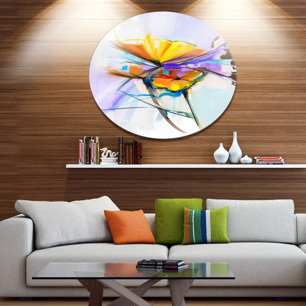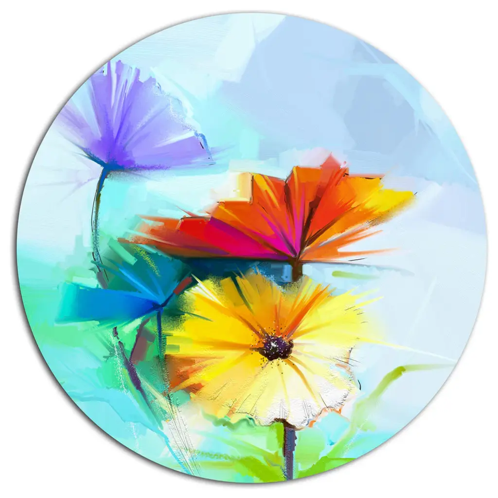 Bring Contemporary Abstraction to your home with this large Circle Metal wall art. This Bouquet Flowers on Light Green Blue Metal Artwork makes it the focal point of any room or office. - White Gloss Coating ensures colors are extra vibrant with light reflection.- Aluminum grade Sheet Metal with 1 inch mounting frame on the back giving the illusion that the artwork is floating on the wall..- Mounting Brackets are included along with instructions.- High Quality Digital images are created directly into a glossy aluminum panel producing a stunning and captivating print into the glossy finish of the metal.- Water, Fire and Scratch resistant HD Aluminum panels.- Looks better than any photo paper and guaranteed to last at least 20 years- Easy to clean with a microfiber cloth. Colors are far superior to regular Canvas Art. - Easy to Hang
