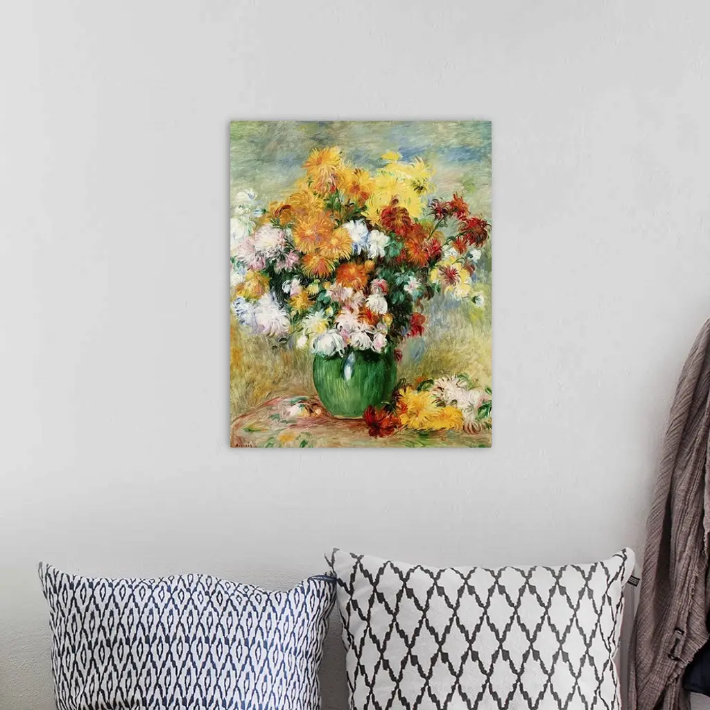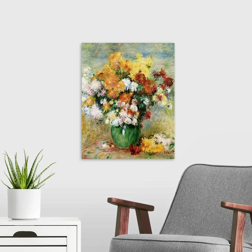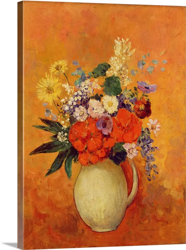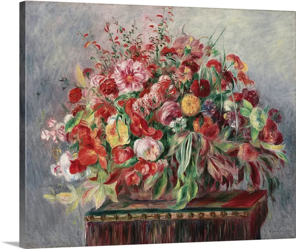 This classic still life painting from an Impressionist master shows numerous blooms of flowers in a vase created with long brush strokes in this vertical wall art.