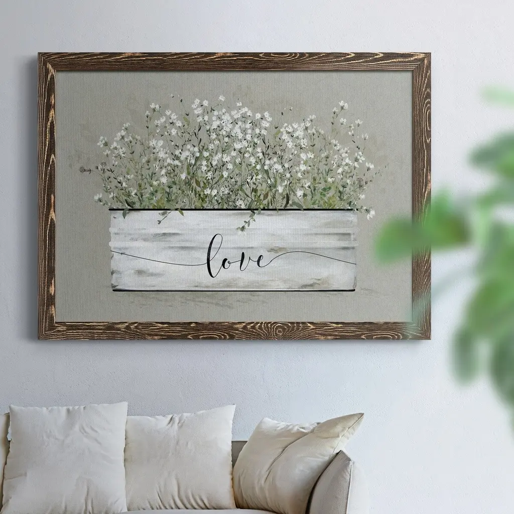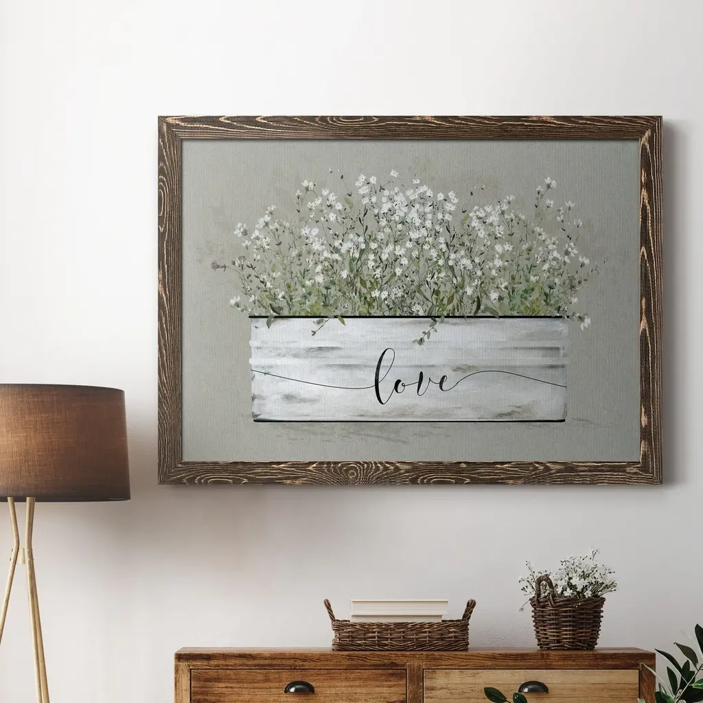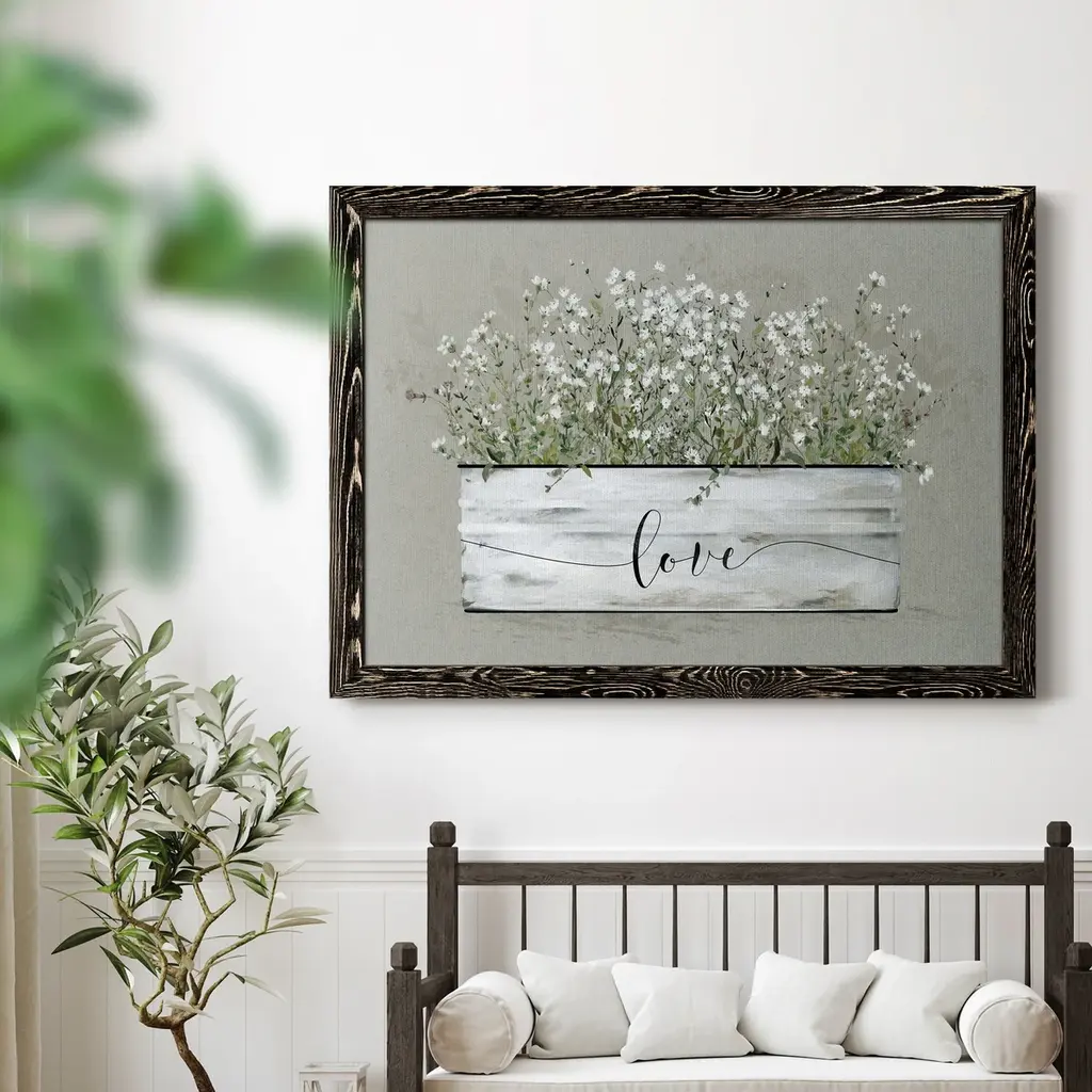 Bouquet of Grace Bucket Love-Premium Framed Canvas - Ready to Hang Framed in distressed wood and available in an array of sizes and colors Each piece is joined and assembled by hand and comes ready to hang FRAMED CANVAS GICLEE READY TO HANG MADE IN THE USA SOLID WOOD FRAME MADE IN USA FADE RESISTANT GICLEE PRINTING on Canvas