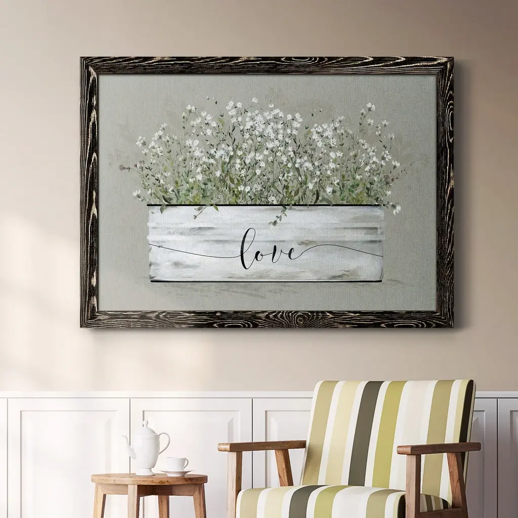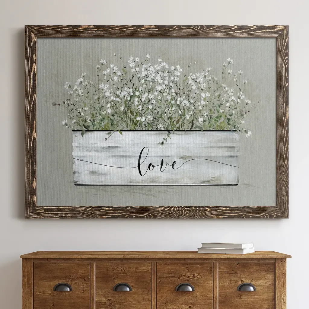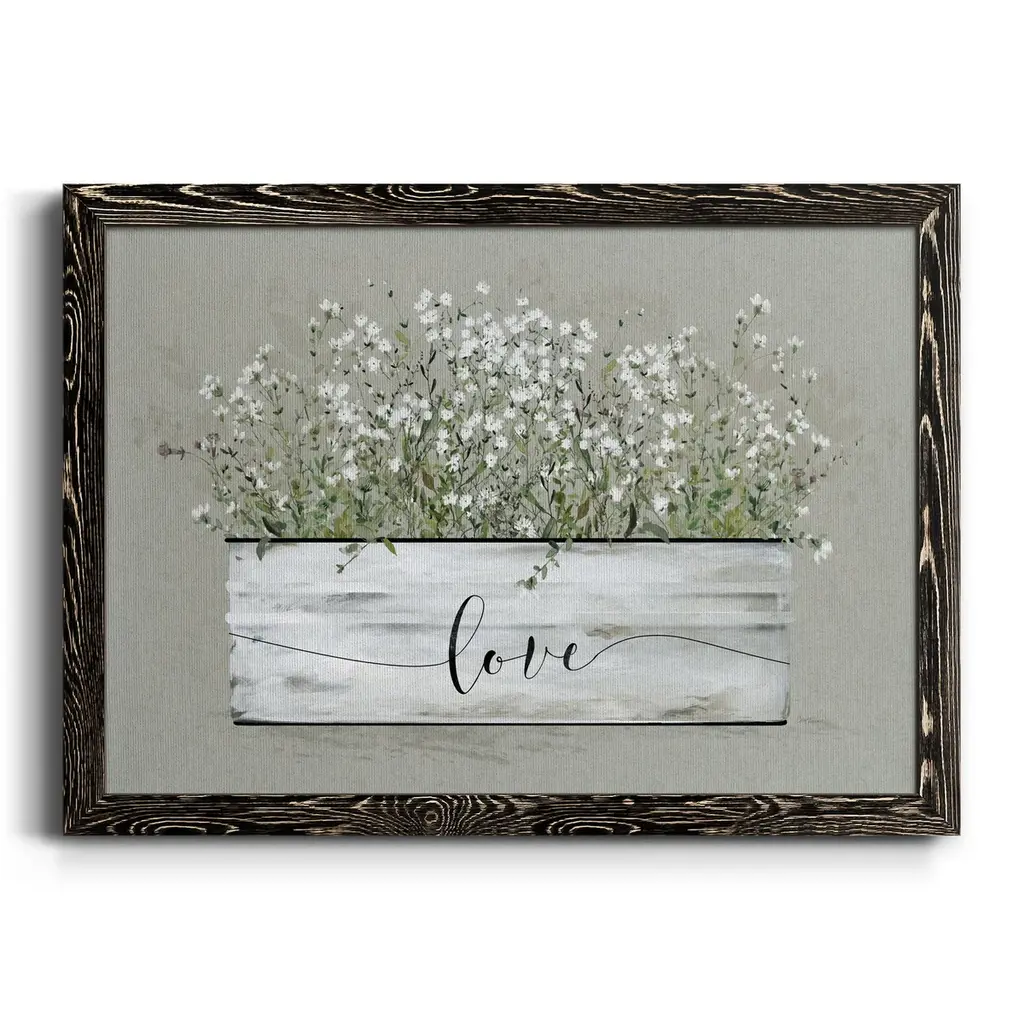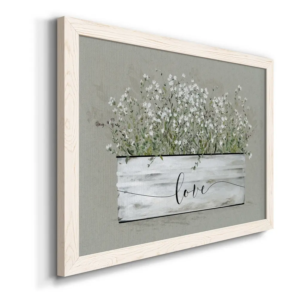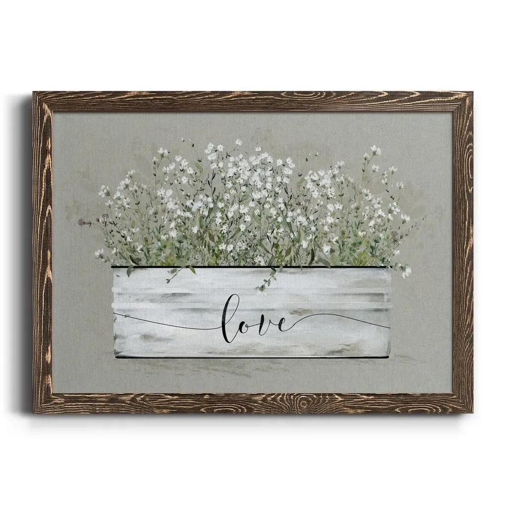 Bouquet of Grace Bucket Love-Premium Framed Canvas - Ready to Hang Framed in distressed wood and available in an array of sizes and colors Each piece is joined and assembled by hand and comes ready to hang FRAMED CANVAS GICLEE READY TO HANG MADE IN THE USA SOLID WOOD FRAME MADE IN USA FADE RESISTANT GICLEE PRINTING on Canvas