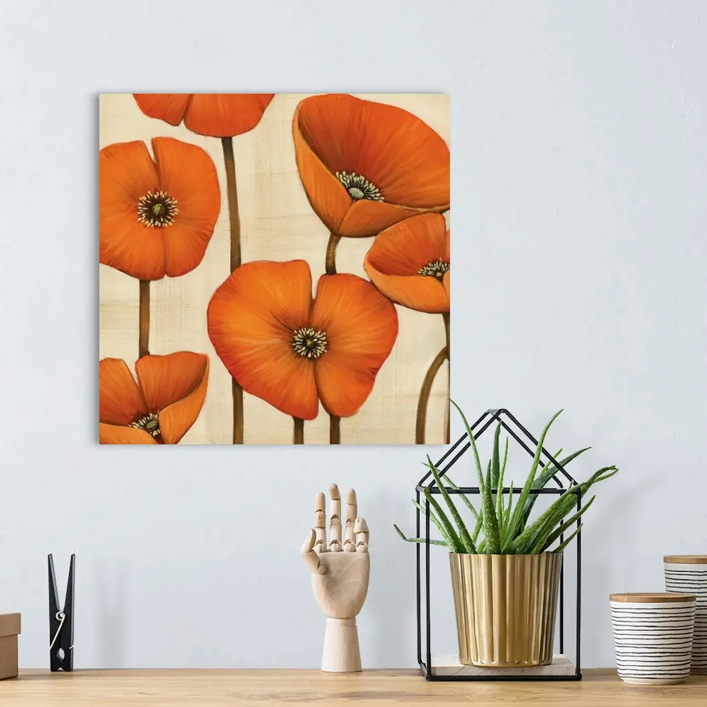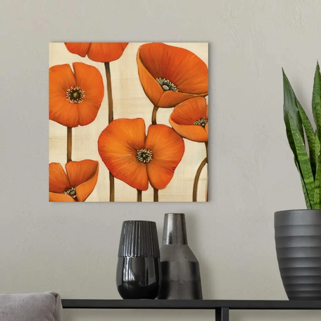 Square contemporary artwork of orange poppy flowers against a neutral backdrop.
