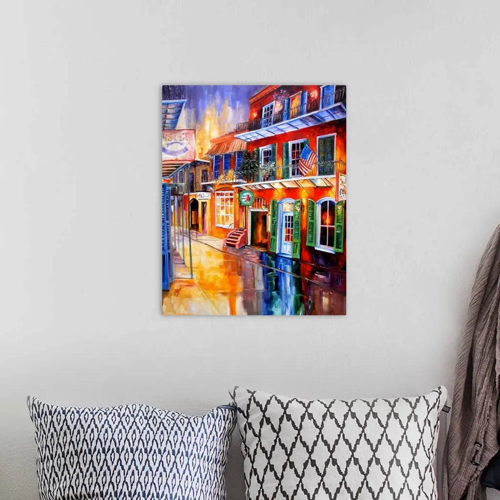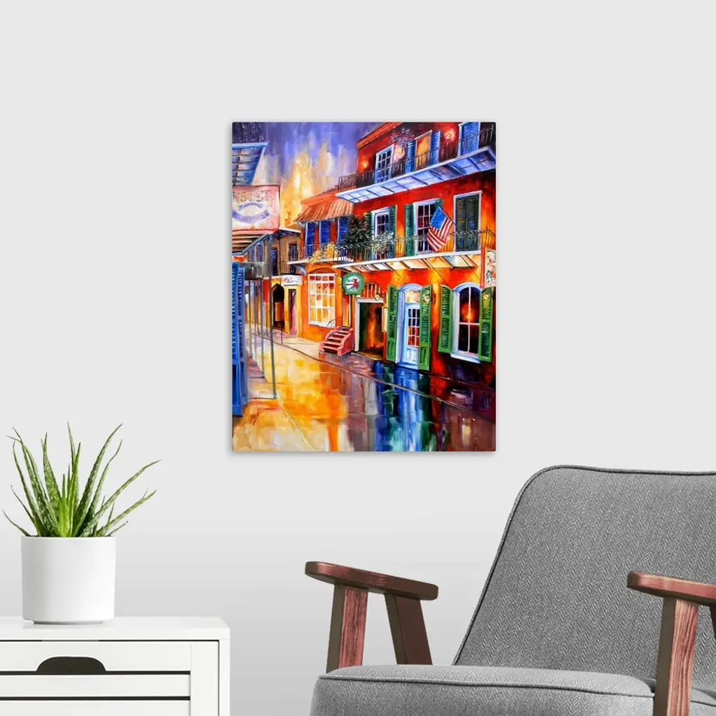Piece of contemporary artwork that uses a rainbow of colors to paint a street in New Orleans lined with brightly colored buildings that reflect on the road.
