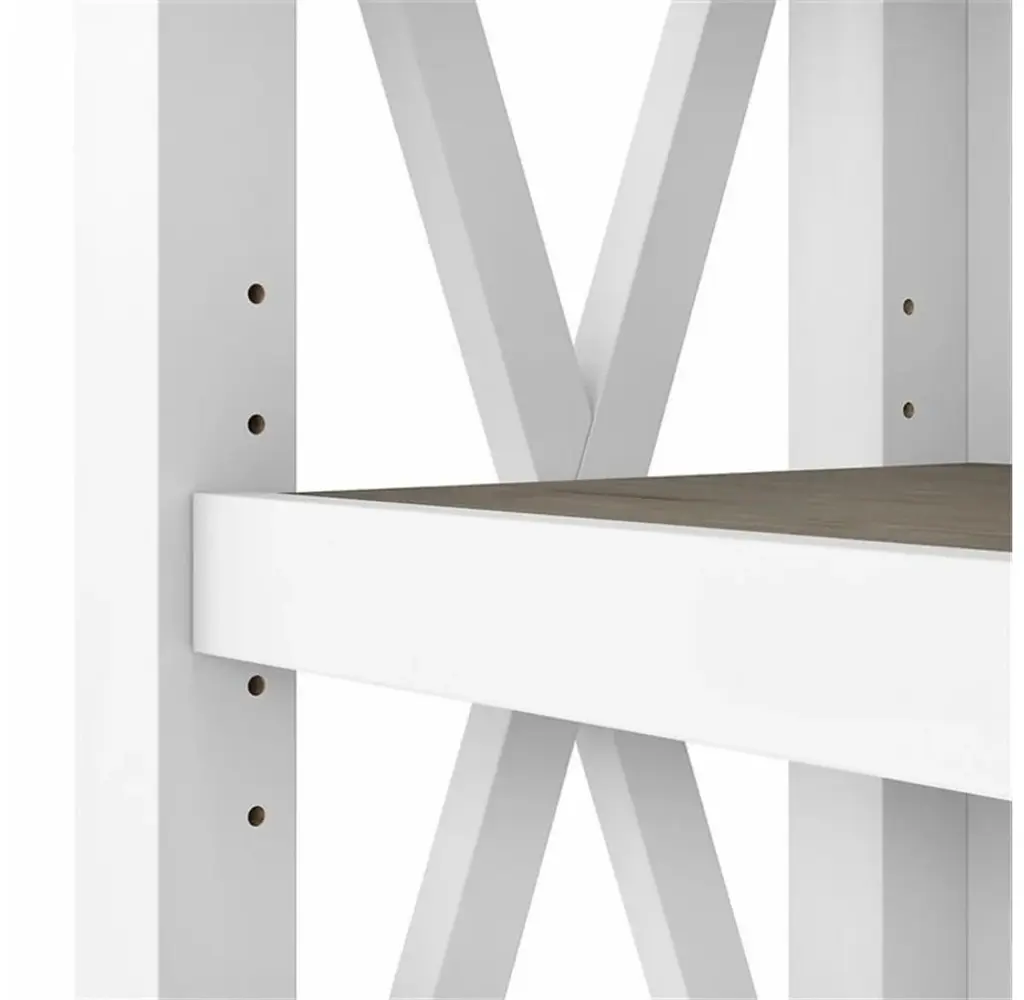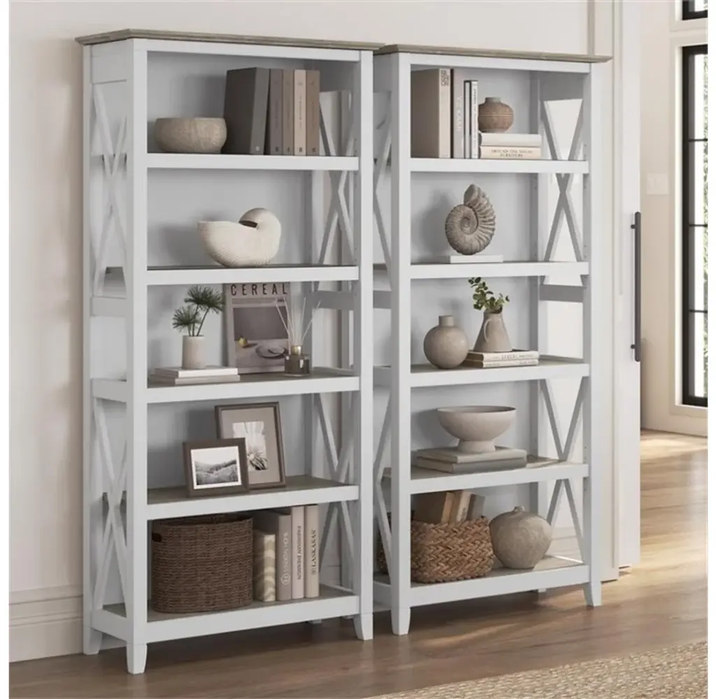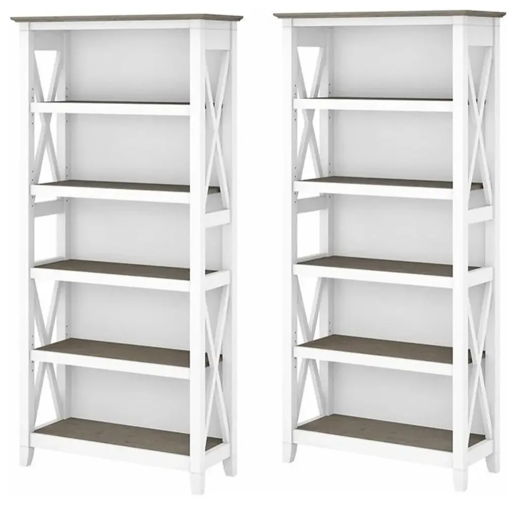 The Bowery Hill Tall 5 Shelf Bookcase Set is a perfect way to show off your favorite artwork, photos, plants and more. These matching Bookcases each include three adjustable shelves to accommodate items of various sizes and two fixed shelves for stability. Each shelf supports up to 50 pounds so you can store your collection of paperback and hardcover books or display decorations with confidence. Place the tall bookshelf set side by side to create a storage wall or position them separately based on the needs of your space. Stylish touches include X pattern accents on the side panels as well as a sturdy and attractive post leg design. Wall attachment hardware is included for family-friendly safety and security in any home office or living room. These 5 Shelf Bookcases are tested to meet ANSI/SOHO quality standards for safety.Features:Bundle includes: Tall 5 shelf bookcase set of 2Material: Engineered woodFinish: Shiplap gray, whiteMatching bookcases feature three adjustable shelves for flexibility and two fixed shelves for stabilityEach shelf can store your personal library and display decorations with confidenceUnique X pattern accents on side panels gives the tall bookshelf set a relaxed and airy appearanceWall attachment hardware included for family-friendly safety and securitySturdy and attractive post leg design withstands years of use in a home office or living roomMultiple finish options allow you to choose the perfect farmhouse style for any living spaceTested to meet ANSI/SOHO quality standards for safety and performanceSpecifications:Product Dimensions: 65.98"H x 31.73"W x 12.64"DProduct Weight: 131.1 lbsNumber of Shelves: 5Shelf Weight Capacity: 50 lbsAssembly Required: Yes
