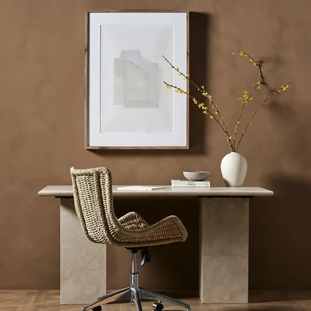 The Box II Wall Art from Four Hands exemplifies Fox Print's inventive approach to mixed media. The Oregon studio's playful exploration of form appears in both vertical and horizontal orientations, crafted on textured fine art paper. The rustic walnut frame and acrylic glazing enhance the architectural elements within the composition. Available as a standalone piece or paired with Box I, this Austin-crafted artwork determines the studio's versatility across multiple artistic disciplines, from photography to product design.