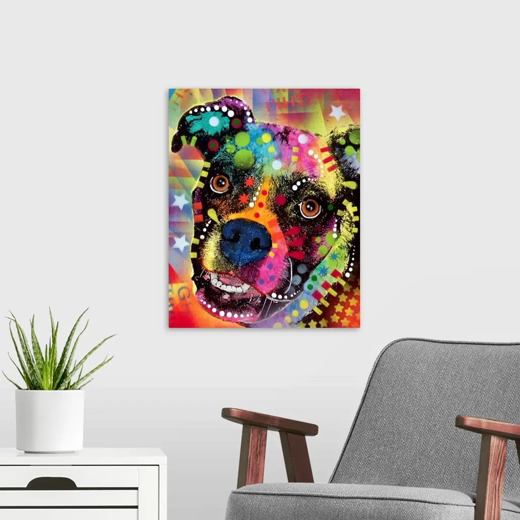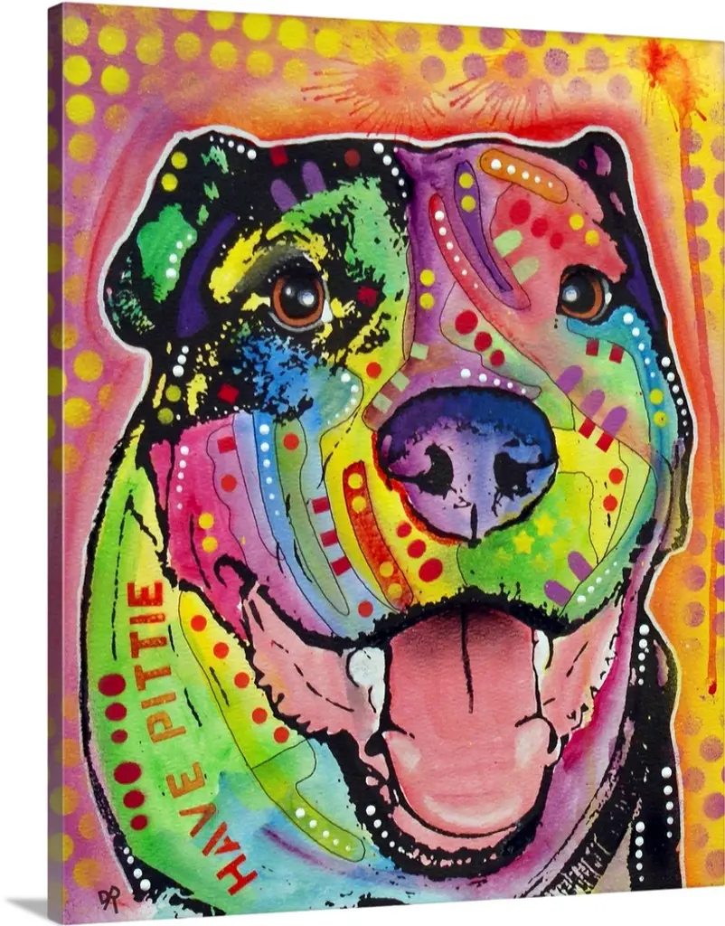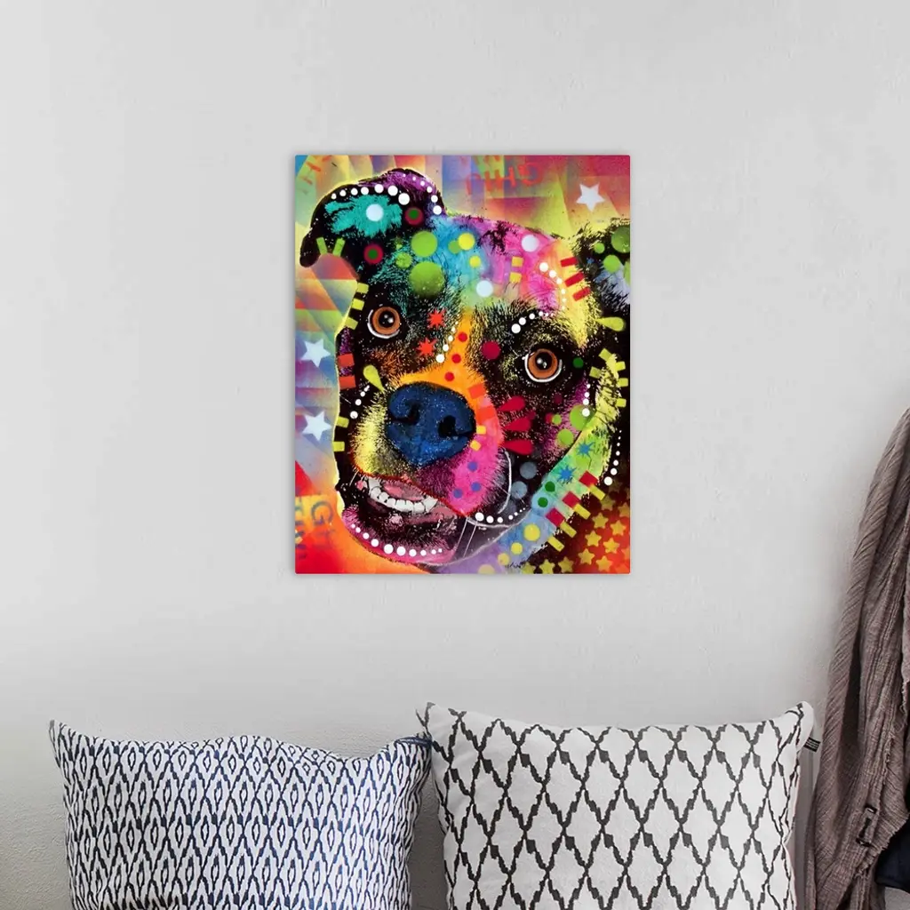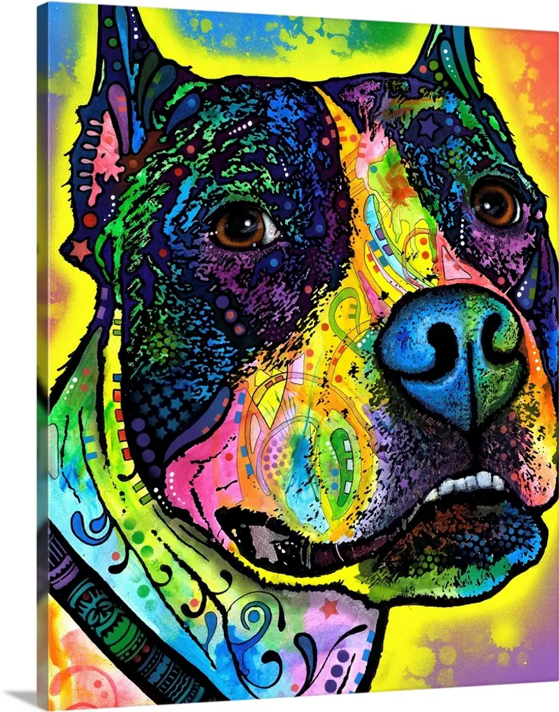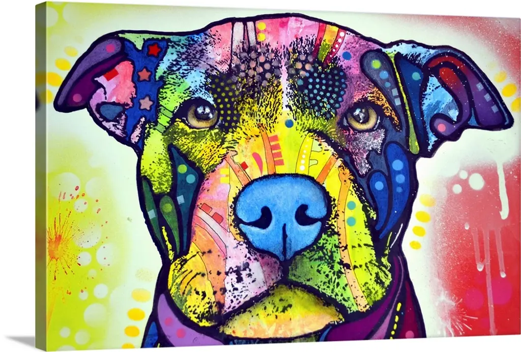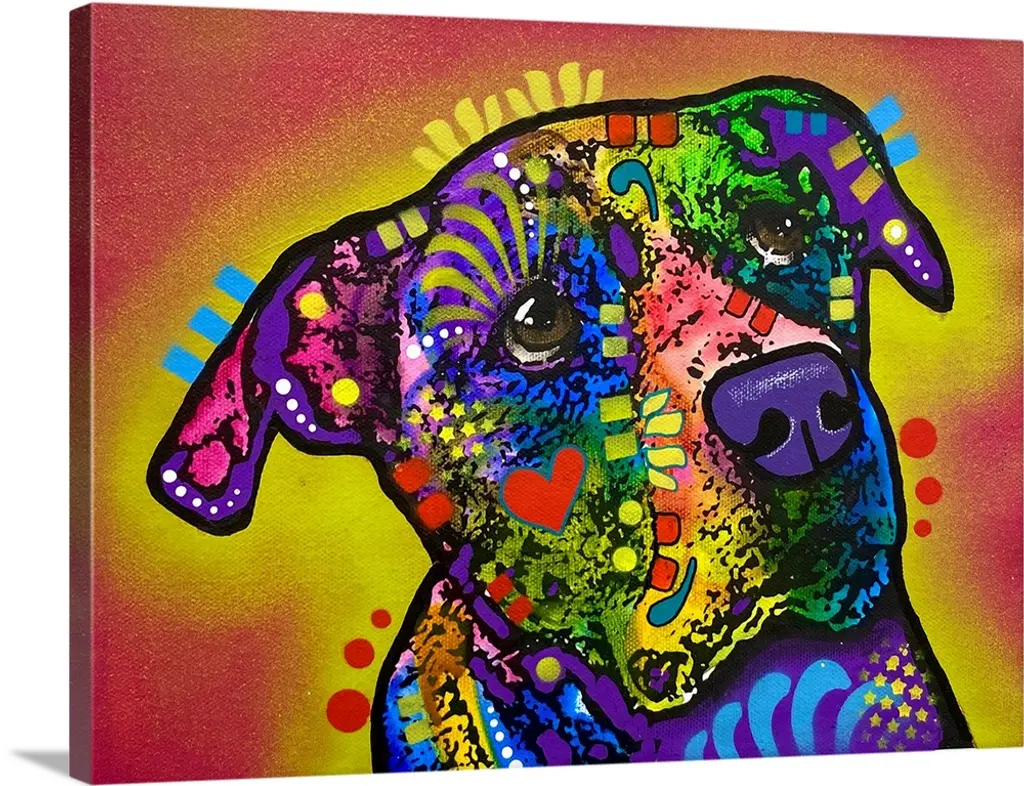 Contemporary stencil painting of a dog filled with various colors and patterns.