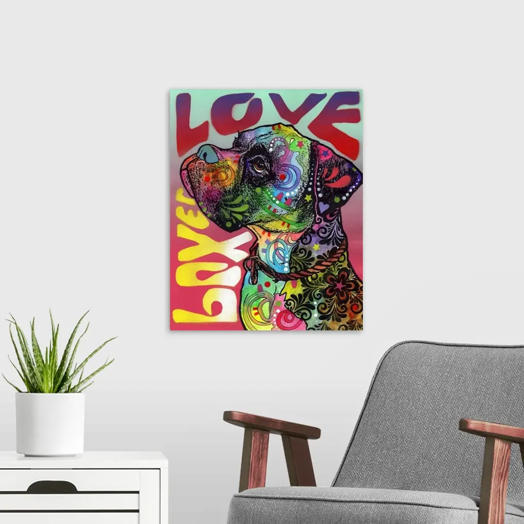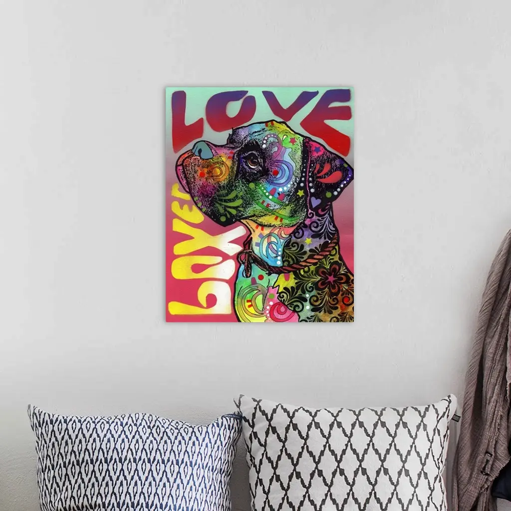 "Boxer Love" written around a colorful painting of a Boxer with abstract markings and a rope collar.