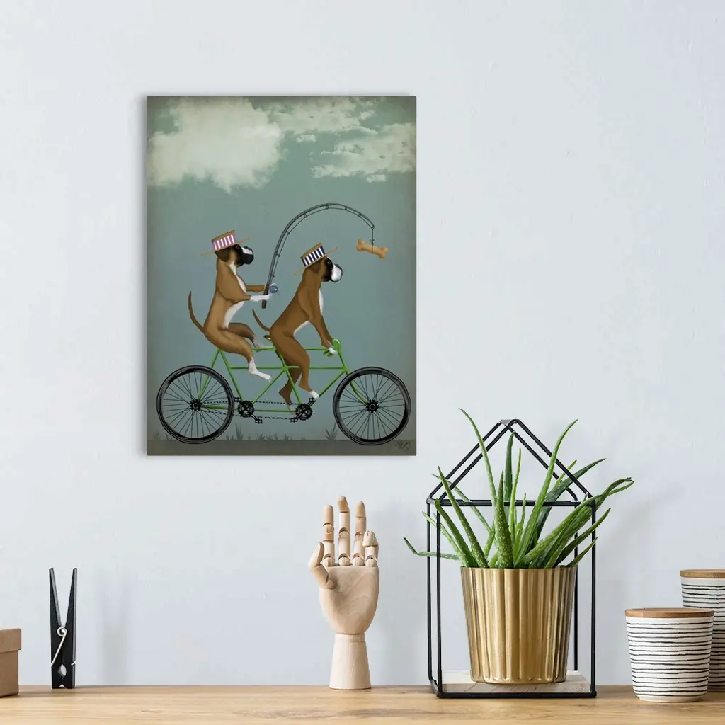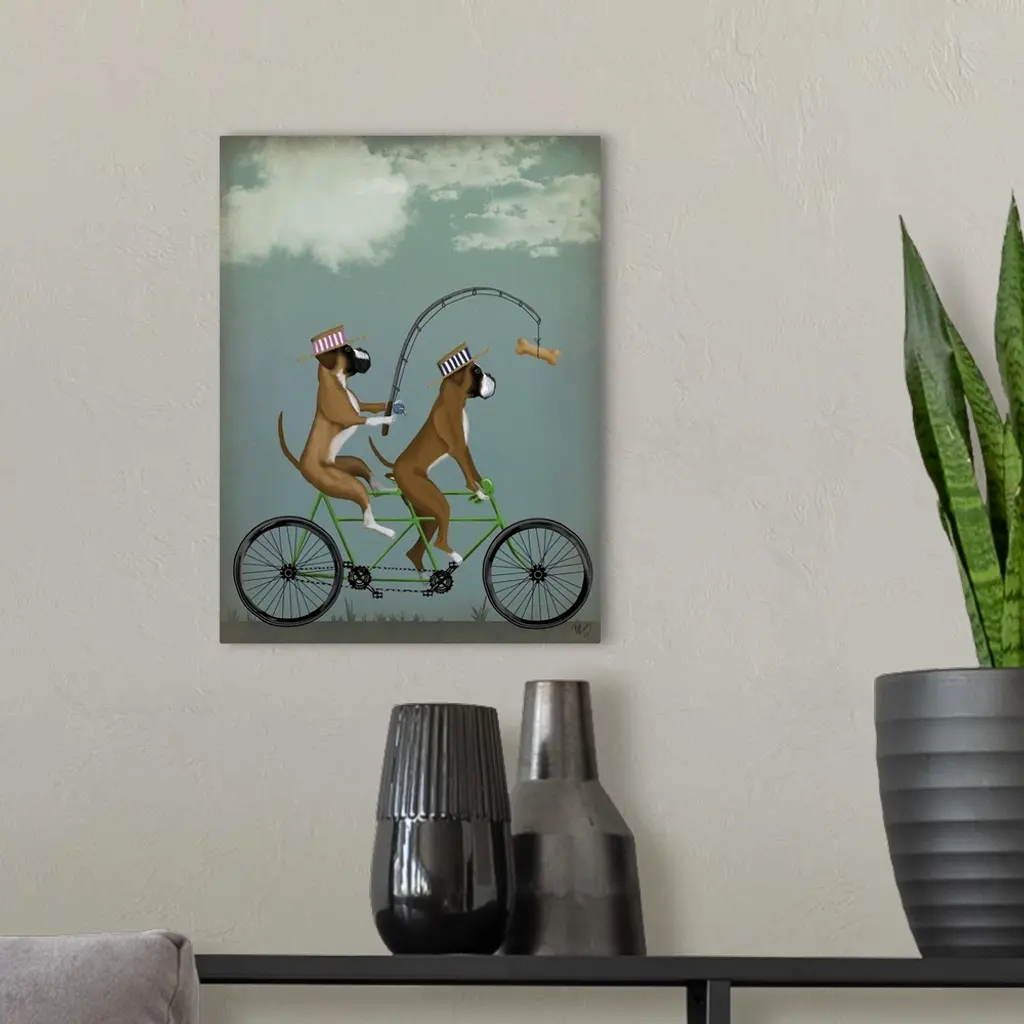 Decorative artwork of two boxers wearing hats riding on a green tandem bicycle with the dog in the back holding a fishing rod over the dog in the front with a bone dangling.
