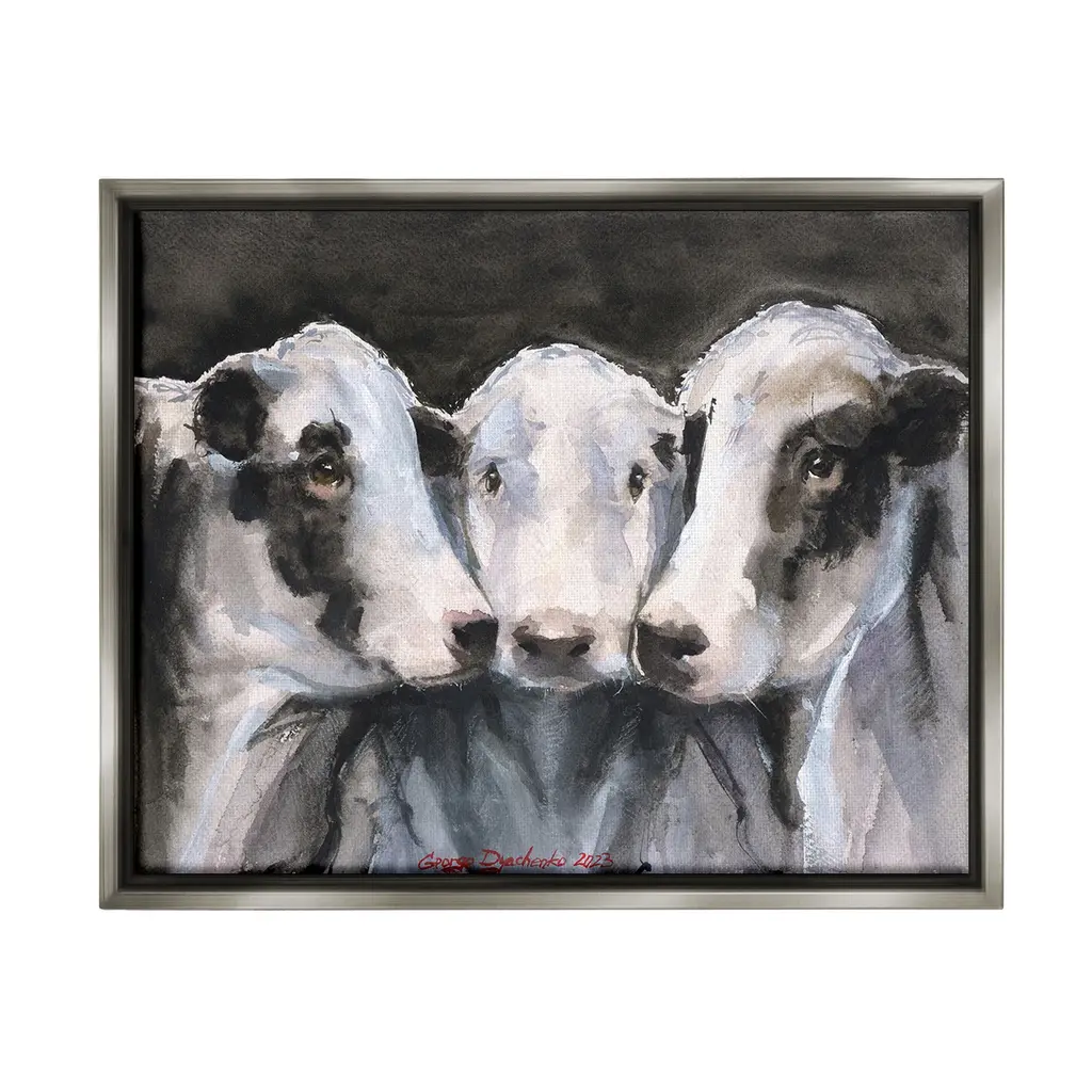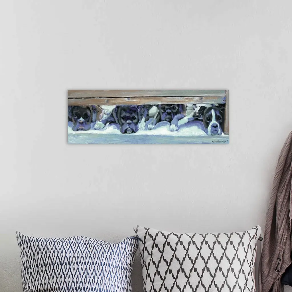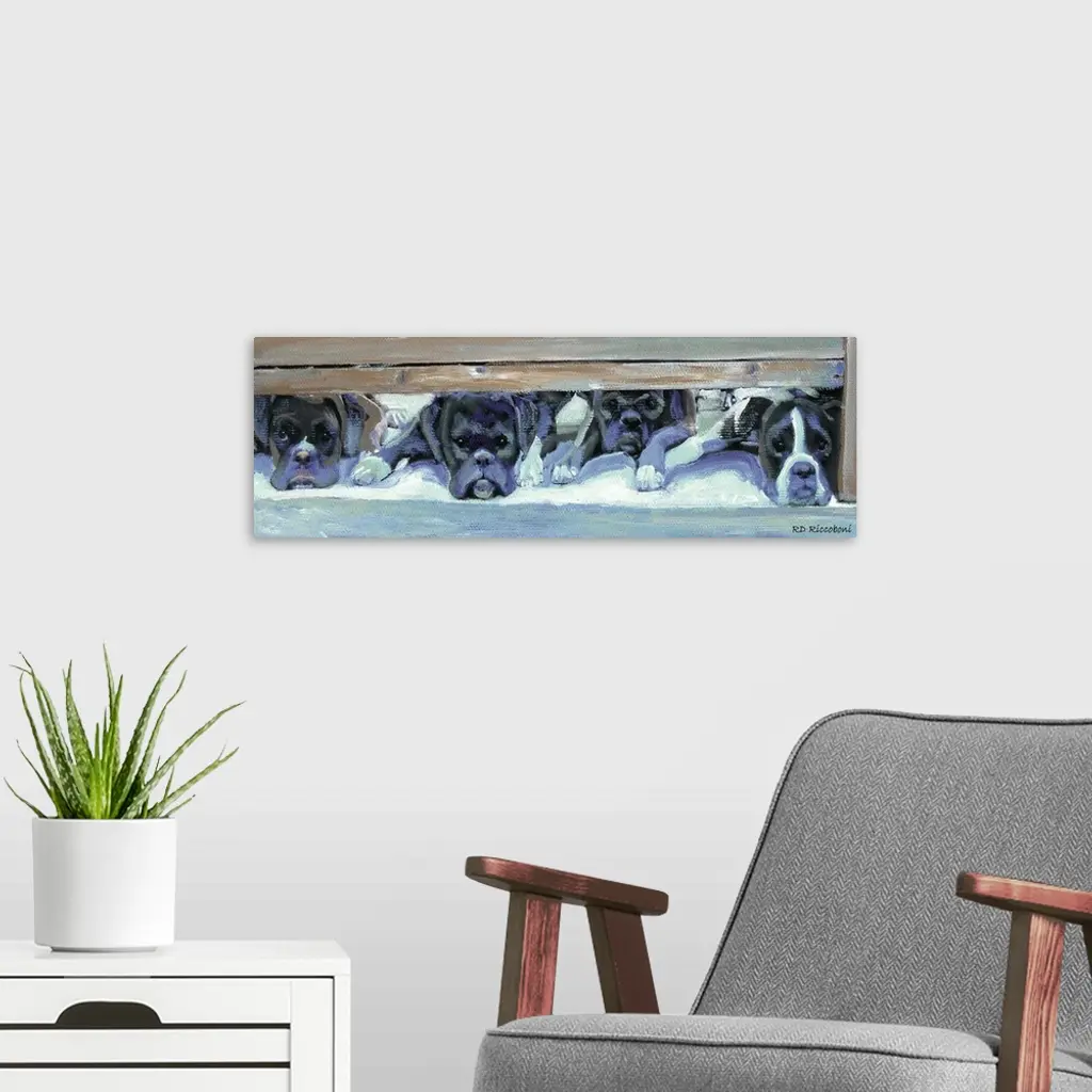 Panoramic painting in cool tones of four boxers laying underneath a bed waiting to be called out.
