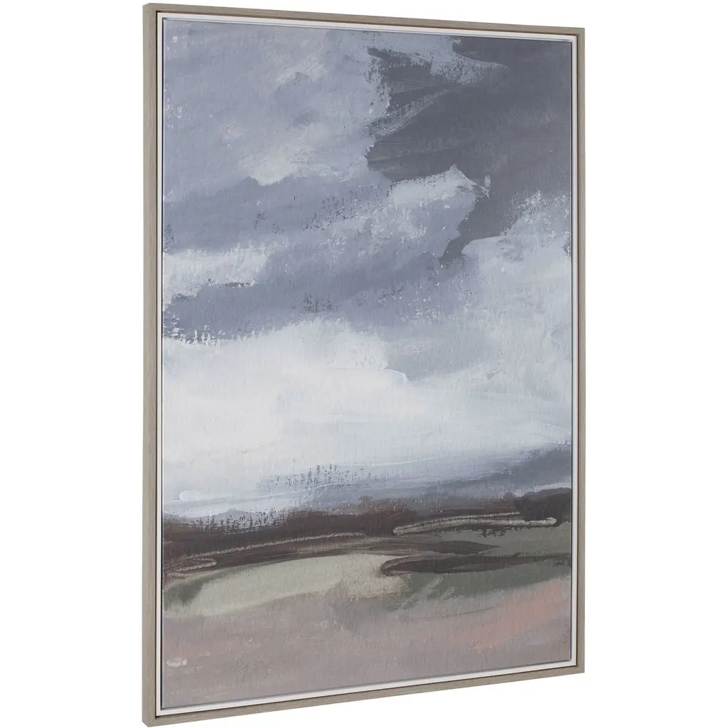 Bracing Depicts A Turbulent Sky, Dominated By Shades Of White And Gray, Contrasted With A Muted Foreground Of Browns, Greens, And Pinks. A Double Gallery Frame, In White And Gray Washed Wood, Encases The Artwork. Each Canvas Is Proudly Handcrafted And Printed In The USA. Artwork By Pamela Munger.