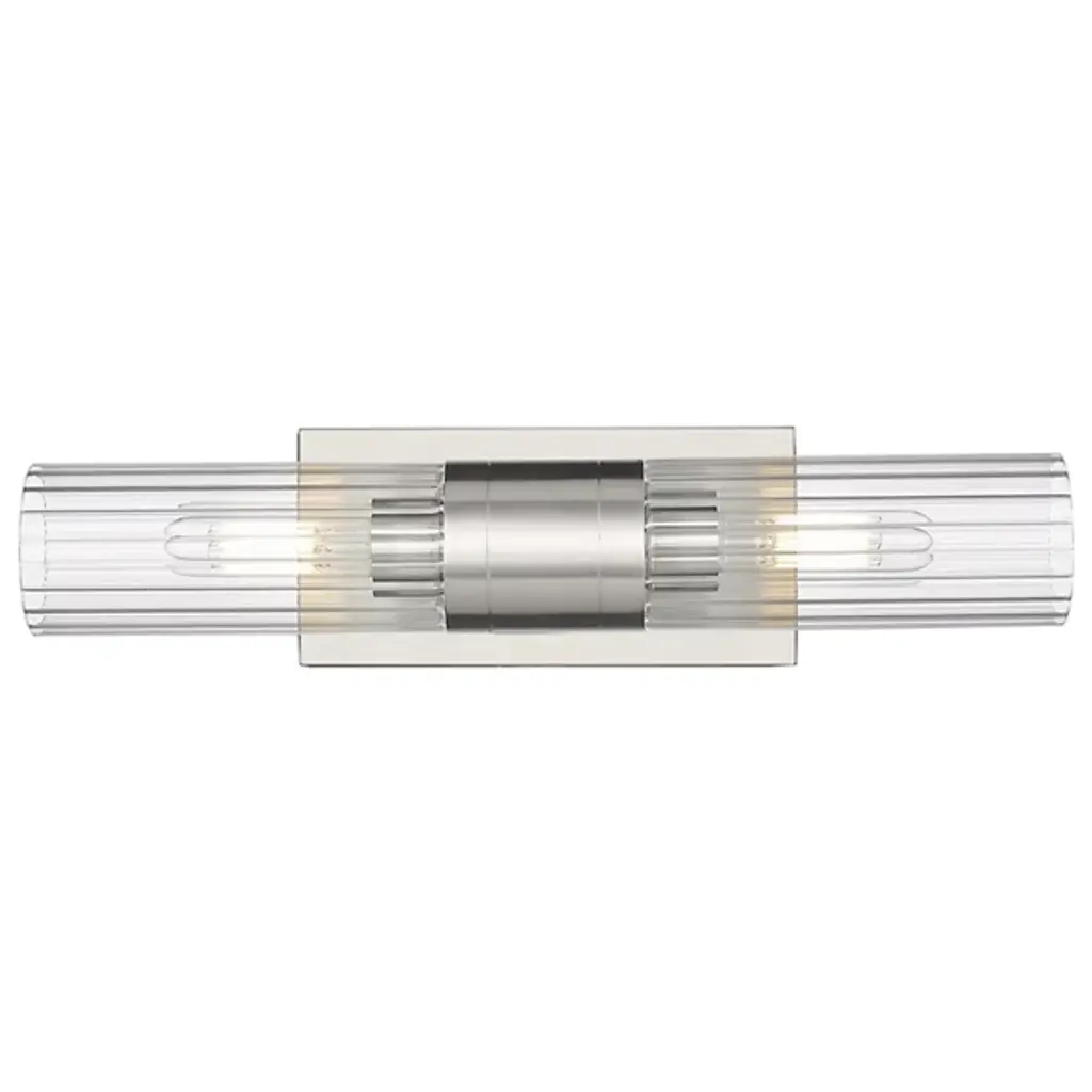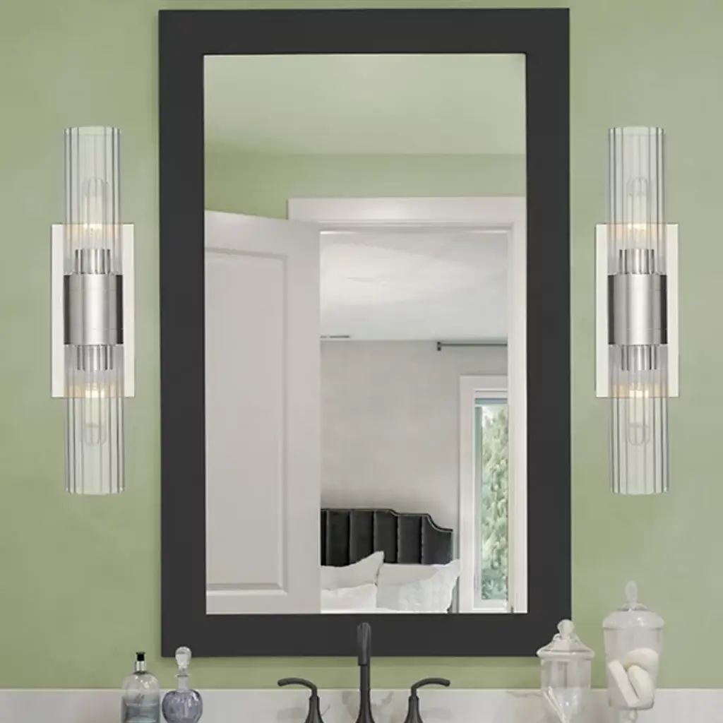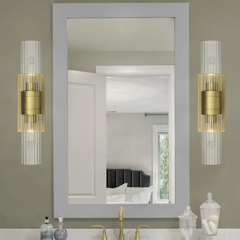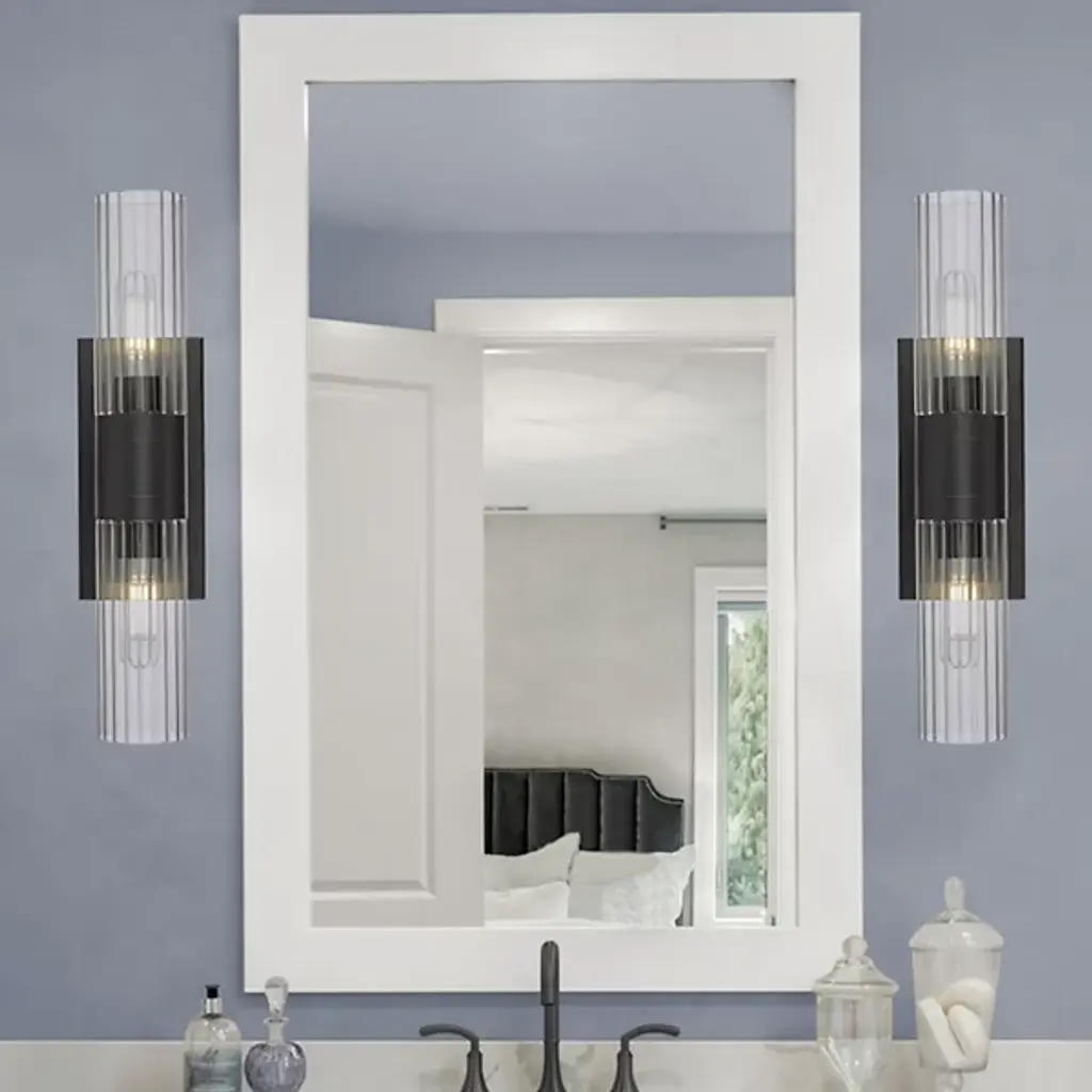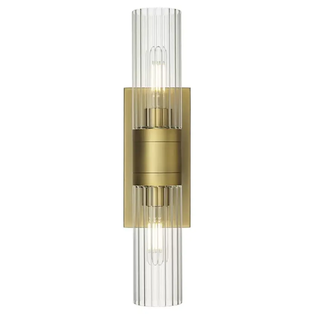 Modern bathroom lighting with eye-catching industrial touches. The Braddock Vanity Light by Alder & Ore has a rectangular wall plate and a round shade holder made of steel and cast brass. The shade holder is designed to both securely support and visually complement the smooth lines of the 2 cylindrical glass shades. The overall look of this vanity light is long and lean, and it offers vibrant functionality in vanity areas and bathrooms. Can be installed horizontally or vertically.