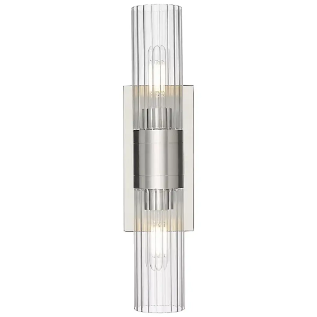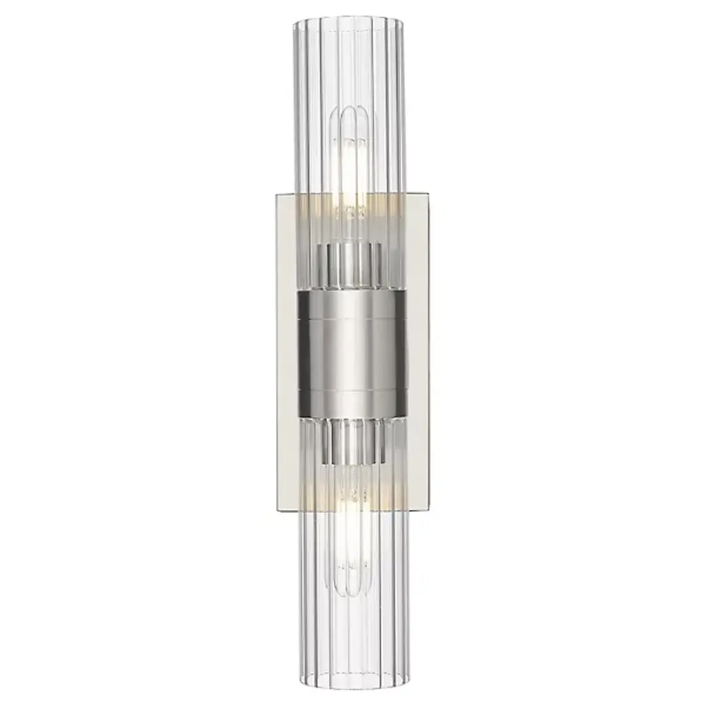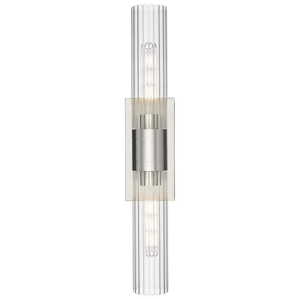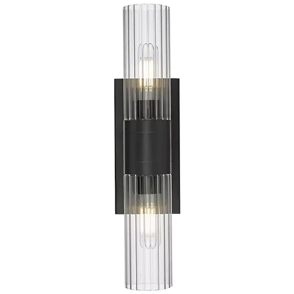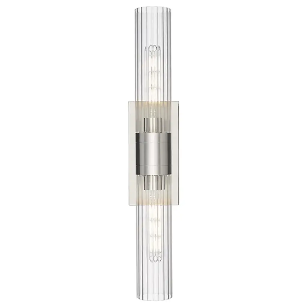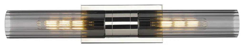 Modern bathroom lighting with eye-catching industrial touches. The Braddock Vanity Light by Alder & Ore has a rectangular wall plate and a round shade holder made of steel and cast brass. The shade holder is designed to both securely support and visually complement the smooth lines of the 2 cylindrical glass shades. The overall look of this vanity light is long and lean, and it offers vibrant functionality in vanity areas and bathrooms. Can be installed horizontally or vertically.